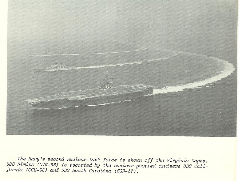 105k | "The Navy's second nuclear task force is shown off the Virginia Capes. USS Nimitz (CVN-68) is escorted by the nuclear-powered cruisers USS California (CGN-36) and USS South Carolina (CGN-37)." From the NAVSEA Journal. This photo was possibly taken in 1975. |