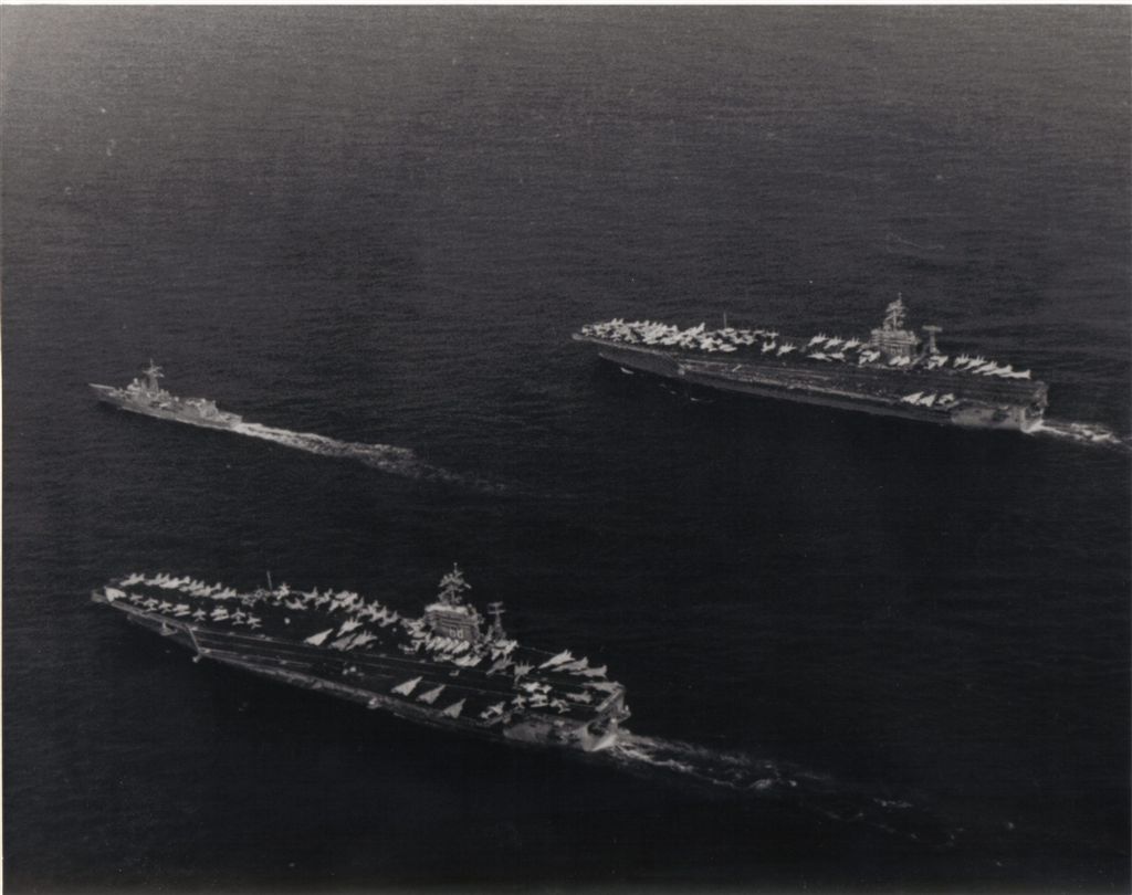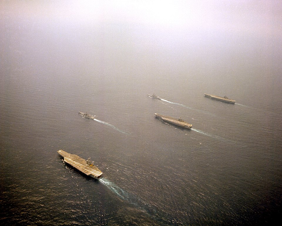 140k | An aerial port view of (fore to back) the guided missile destroyer USS Richard E. Byrd (DDG-23), the nuclear-powered aircraft carrier USS Nimitz (CVN-68), the replenishment oiler USS Kalamazoo (AOR-6), and the guided missile cruiser USS Josephus Daniels (CG-27) underway. The ships were part of Carrier Group Eight. Photo by PH1 R. Beno, February 5, 1987 available from the Defense Visual Information Distribution Service, id.: DN-SC-87-03840. |