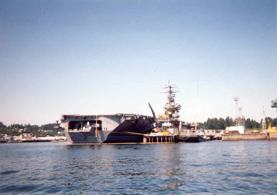 45k | USS Nimitz (CVN-68) entered drydock at Puget Sound Naval Shipyard (PSNS) on January 29, 1994. Ex-submarine tender Proteus (IX 518, ex-AS 19) became her berthing, messing and office barge. As Nimitz was the first ship to use Proteus in this fashion, the latter required extensive conversion work to make her habitable. Following the flooding of the dock, August 20–21, 1994 Nimitz moored to Pier B at PSNS, as shown here. |