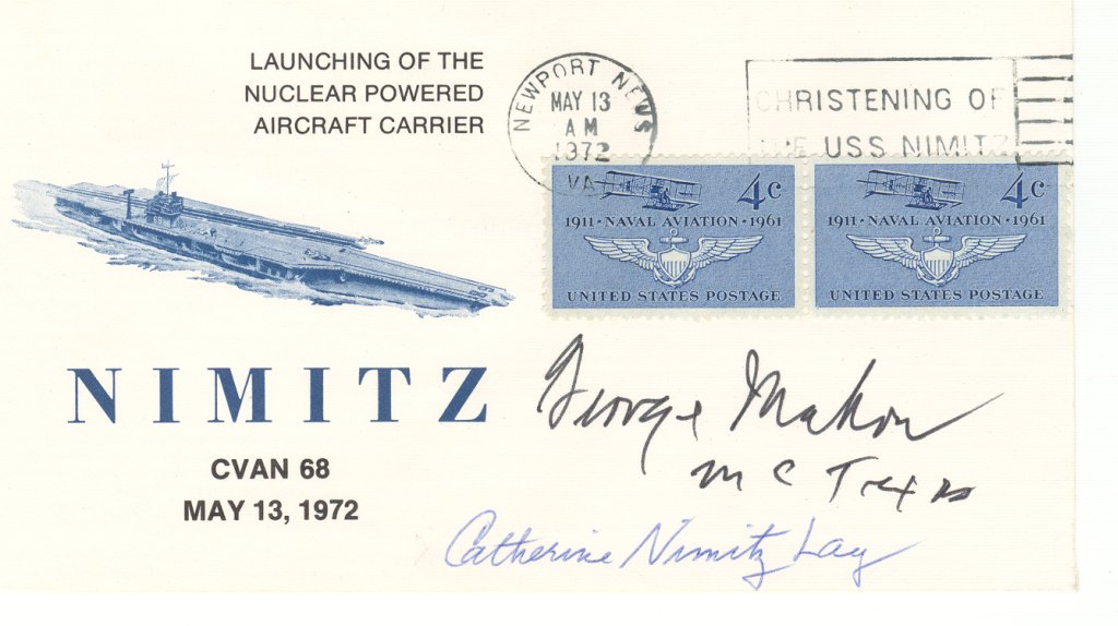 88k | Christening cachet signed by Mrs. James T. (Catherine Nimitz) Lay, eldest daughter of Admiral Nimitz and ship's sponsor, and Rep. George Mahon of Texas, principal speaker at the christening ceremony. |