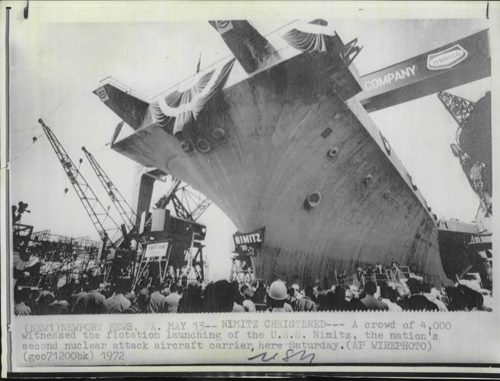 106k | "(NEW1) NEWPORT NEWS, VA. MAY 13[,1972]—NIMITZ CHRISTENED—A crowd of 4,000 witnessed the flotation launching of the U.S.S. Nimitz, the nation's second nuclear attack aircraft carrier, here Saturday. (AP WIREPHOTO)(geo71200bk) 1972" |