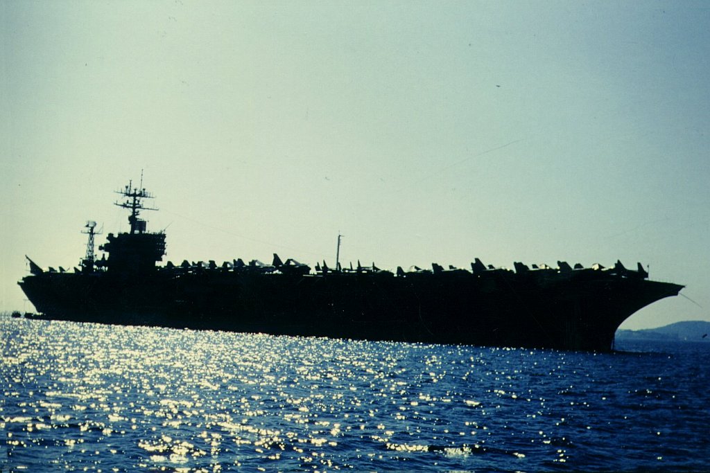 237k | USS Nimitz (CVN-68) at anchor (Augusta Bay, Italy?), 1987, during her East-to-West Coast deployment via Cape Horn. |
