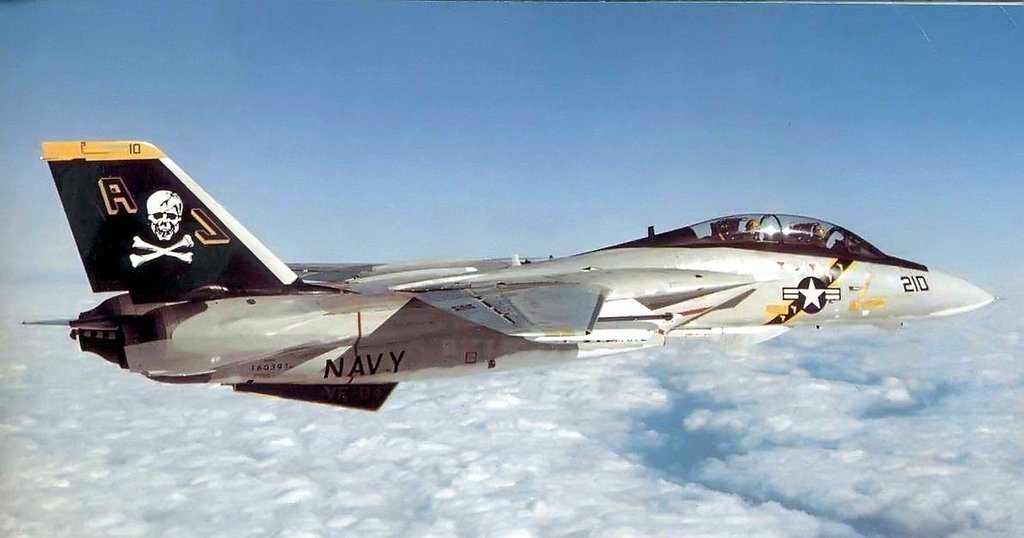 563k | F-14B TARPS Tomcat (BuNo 161610?, modex NG-103), Fighter Squadron (VF) 211 "Checkmates," Naval Air Station Oceana, Virginia Beach, Virginia, and deployed aboard USS Nimitz (CVN-68), in flight over burning Kuwaiti oil wells during Operation Desert Storm, February 1991. National Archives and Records Administration (NARA), photo # 330-CFD-DN-SC-04-15221. |