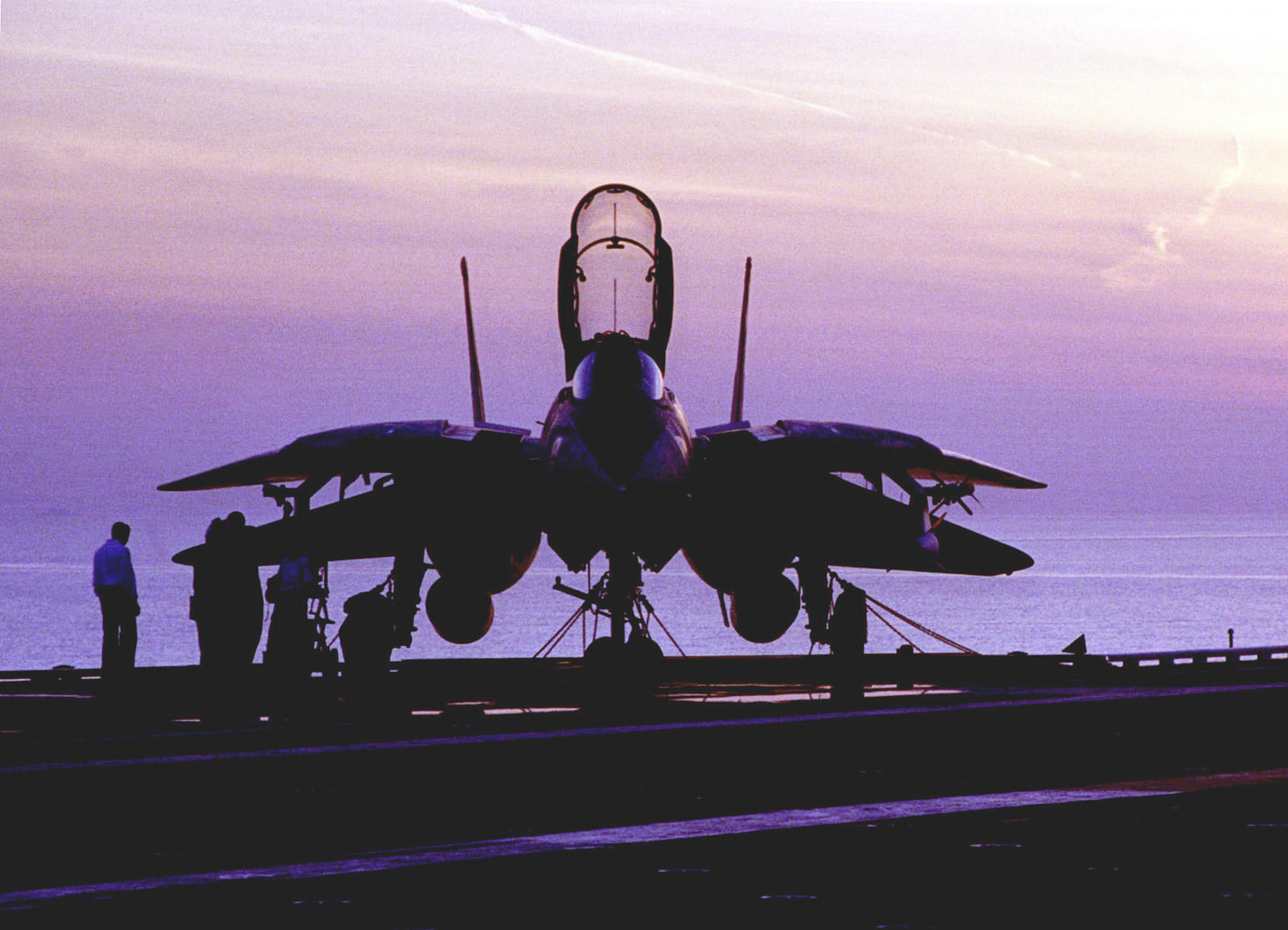 479k | Amidst the orange and purple sunset of the Persian Gulf, an F-14A Tomcat from Fighter Squadron (VF) 211 "Checkmates" sits on the flight deck of USS Nimitz (CVN-68), 14 October 1997, during a break in flight operations. The aircraft carrier and her embarked Carrier Air Wing (CVW) 9 were operating in the Persian Gulf in support of Operation Southern Watch. US Navy photo by PH3 Cash A. Conklin, now in the collections of the National Archives and Records Administration (NARA), # 330-CFD-DN-SD-00-03280. |