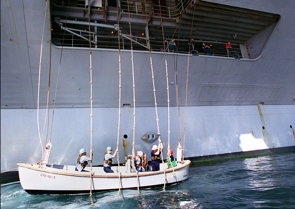 153k | U.S. Navy sailors prepare a motor whale boat for hoisting aboard the nuclear-powered aircraft carrier USS Nimitz (CVN-68). Operation Southern Watch, Persian Gulf, 13 October 1997. |