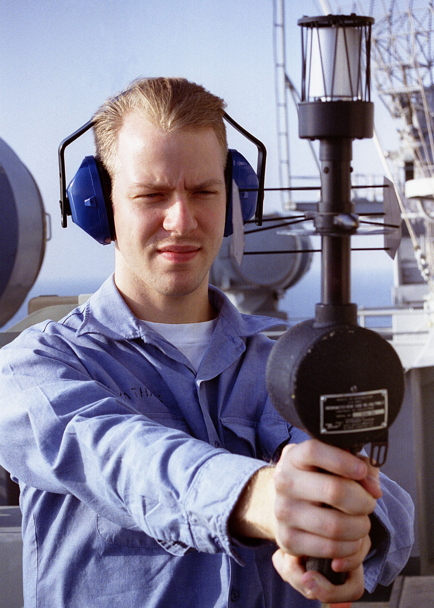 915k | Aerographer's Mate 3rd Class Michael Slaathaue operates a hand-held anemometer to determine wind velocity and direction aboard USS Nimitz (CVN-68), 20 October 1997. The nuclear-powered aircraft carrier and her embarked Carrier Air Wing (CVW) 9 were deployed in the Persian Gulf to enforce UN sanctions against Iraq by patrolling the "no-fly zone" under Operation Southern Watch. U.S. Navy photo by PHAN Glenn E. Cook (# 971020-N-1386C-221). |
