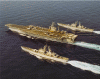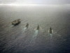270k | December 15, 1997 The guided missile cruiser USS Port Royal (CG-73) and the submarine USS Annapolis (SSN-760) steam alongside the aircraft carrier USS Nimitz (CVN-68) as the sun rises on another day in the North Persian Gulf. U.S. Navy photo by Photographer's Mate 2nd Class Matthew J. Magee. [971215-N-9785M-462]. |