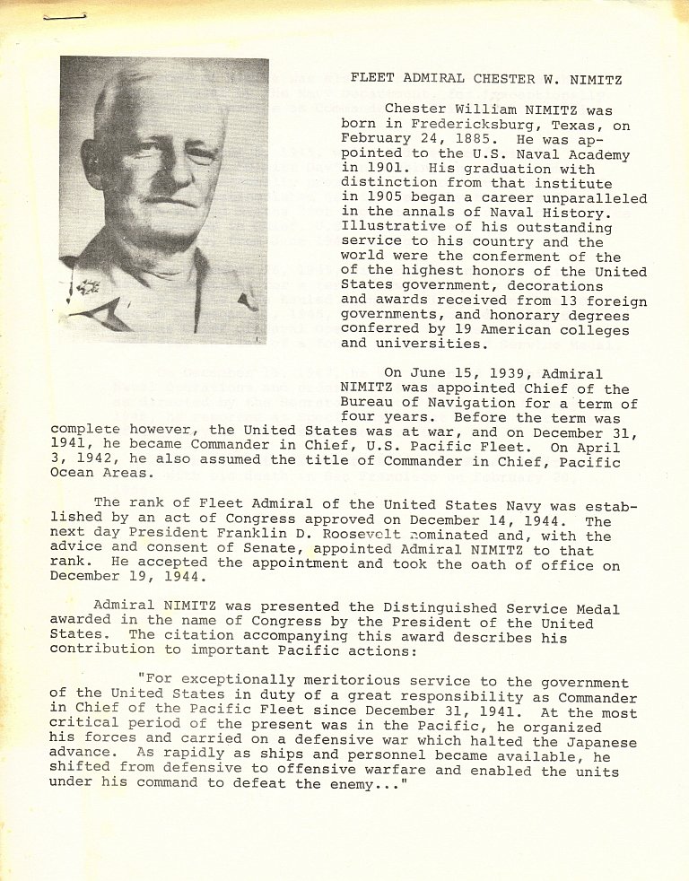 94k | Photo and biography of Fleet Admiral Chester W. Nimitz, from an Information Kit created by the ship's Public Affairs Office in 1976. |