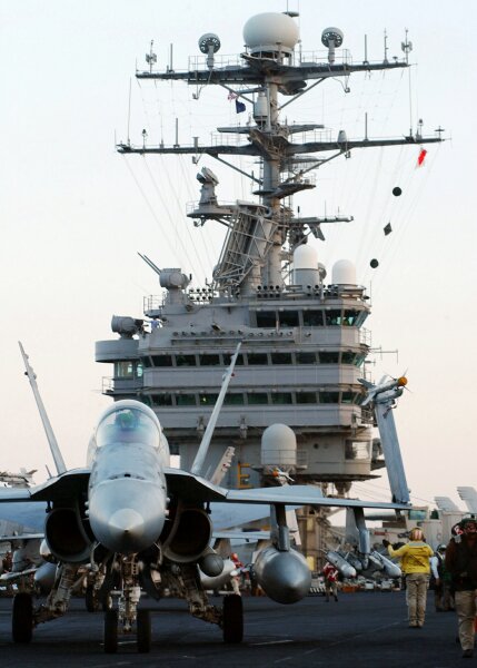 83k | The Arabian Gulf, Mar. 26, 2003 An F/A-18E Super Hornet assigned to the "Fist of the Fleet" of Strike Fighter Squadron Twenty Five (VFA-25) prepares to launch from the aircraft carrier, deployed in support of Operation Iraqi Freedom. U.S. Navy photo by Photographer's Mate 3rd Class Michael S. Kelly. [030326-N-9228K-001]. |