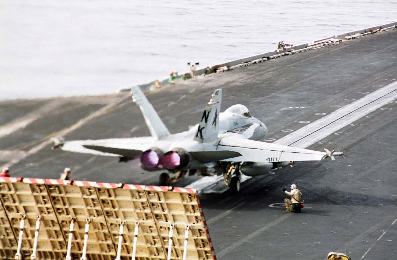 49k | The Pacific Ocean, Jul. 24, 2002 An F/A-18E "Super Hornet" from the “Eagles” of Strike Fighter Squadron One One Five (VFA-115) piloted by Lt. Corey L. Pritchard, makes the first carrier arrested landing of the “Super Hornet” signifying the start of its maiden combat deployment. VFA-115 was assigned to Carrier Air Wing One Four (CVW-14), aboard USS Abraham Lincoln (CVN-72). The Carrier Battle Group deployed on July 20, 2002, and was to conduct missions in support of Operations Enduring Freedom and Southern Watch. U.S. Navy photo by Photographer's Mate 3rd Class Kittie VandenBosch. [020724-N-8794V-001]. |