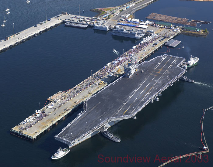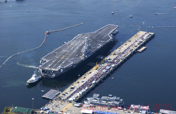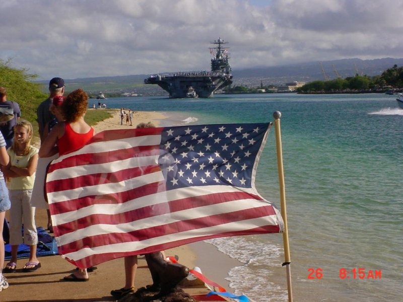 51k | USS Abraham Lincoln (CVN-72) entering Pearl Harbor, 26 April 2003, on her way home from Operation Iraqi Freedom. Photos by SK1(SW) Joseph A. Gless, USN, Mobile Diving Salvage Unit One. |