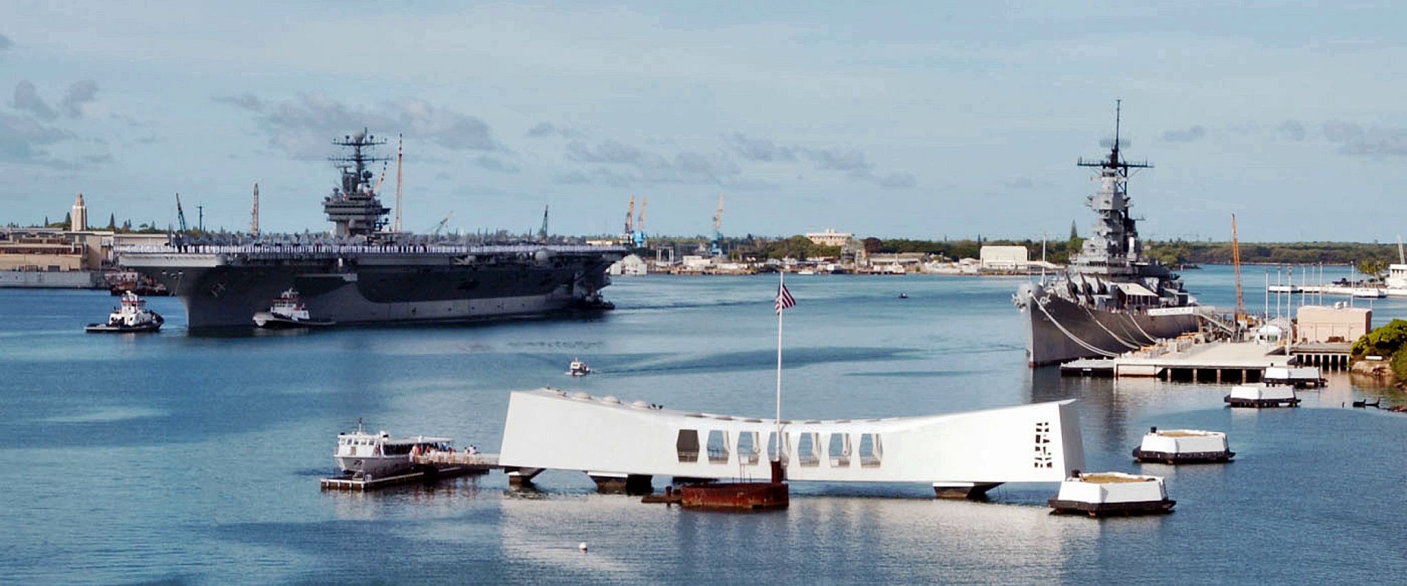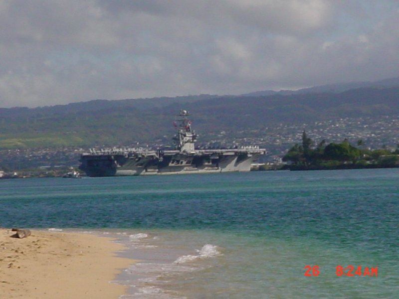 389k | USS Abraham Lincoln (CVN-72) passes the Arizona Memorial, 1 August 2002, as an SH-60F Seahawk helicopter hovers overhead. The Nimitz-class aircraft carrier got underway 20 July from her homeport in Everett, Wash. for a regularly scheduled deployment in support of Operation Enduring Freedom. U.S. Navy (USN) photo by Photographer's Mate 1st Class William R. Goodwin (# 020801-N-3228G-001). |