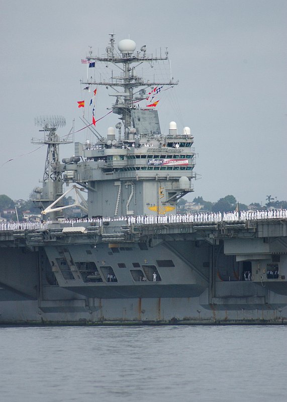 78k | San Diego, Calif., May 2, 2003 Flying her "Homeward Bound" pennant and displaying a banner reading "Mission Accomplished," USS Abraham Lincoln (CVN-72) steams into San Diego Harbor for a stop prior to returning to her homeport of Everett, Wash., following a nearly 10-month deployment in support of Operations Enduring Freedom and Iraqi Freedom. Abraham Lincoln would disembark Carrier Air Wing Fourteen (CVW-14) personnel in San Diego and was scheduled to reach homeport on May 6, marking 286 days away. The homeward bound pennant is a Navy tradition, dating back to the days of sail. It is flown on the last leg of her homebound voyage by a ship that has been overseas for nine months or more, prior to arrival at the first U.S. port. The length is one foot for each person, officer or crew, who has been aboard for 9 months or more, providing the length does not exceed the ship's length. On arrival in homeport, the pennant is cut up. The blue is presented to the captain, and the remainder is divided among the men. U.S. Navy photo by Senior Chief Photographer’s Mate Mahlon K. Miller. [030502-N-0226M-003]. |