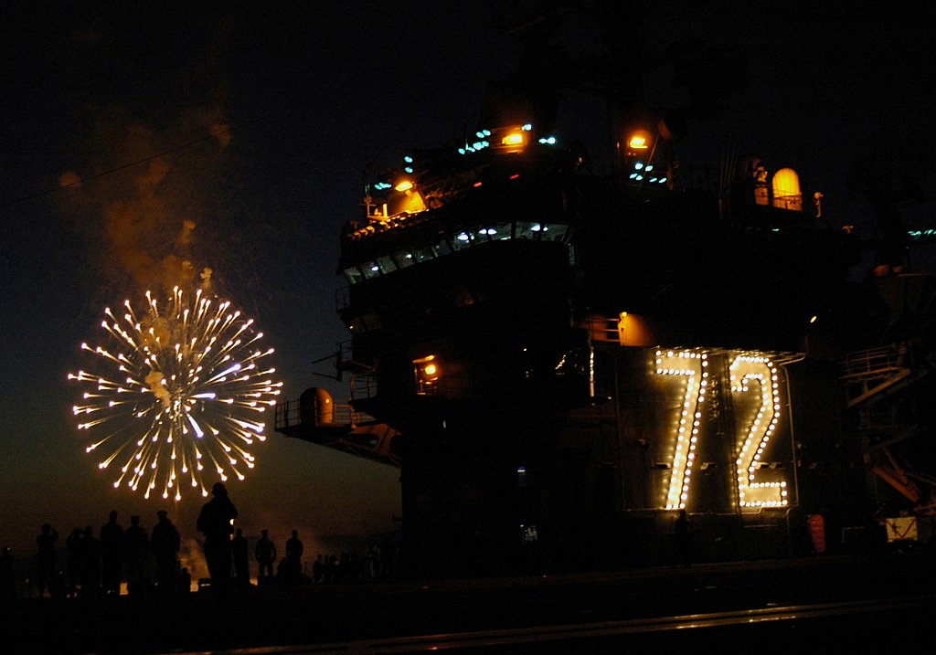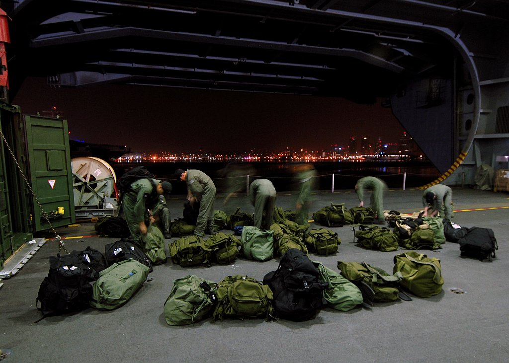 142k | Members of Helicopter Visit Board Search Seizure (HVBSS) Team 1 ready their gear for a non-compliant boarding exercise during the early morning hours of October 22, 2007 aboard USS Abraham Lincoln (CVN-72). HVBSS-1 was the first dedicated HVBSS team to reach operational status and they were training aboard the Nimitz-class aircraft carrier as part of the ship's scheduled work-up. U.S. Navy photo by Mass Communication Specialist 3rd Class James R. Evans (# 071022-N-7981E-009). This photo was taken at the Carrier Pier at North Island. The Midway is visible in the background, along with San Diego's lights. |
