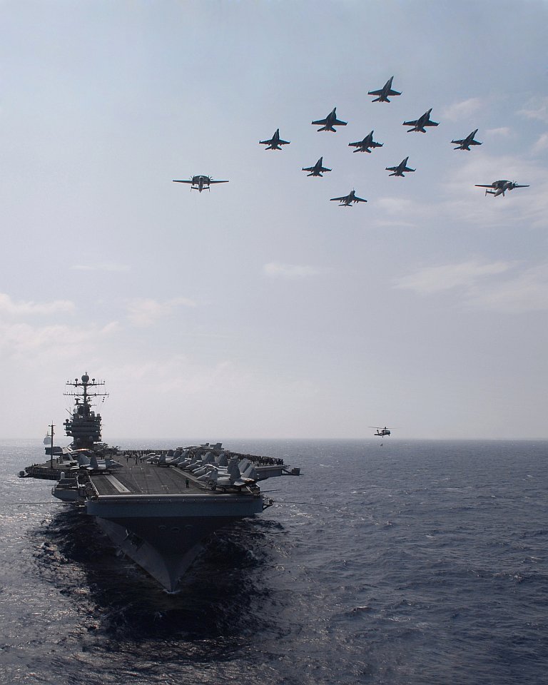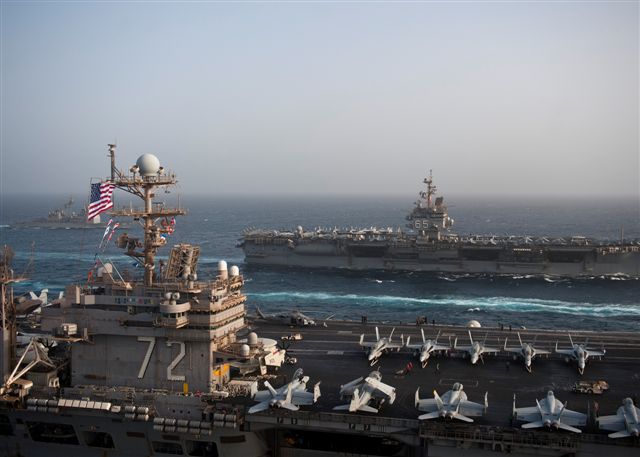 49k | USS Abraham Lincoln (CVN-72), foreground, and USS Enterprise (CVN-65) steam in formation in the North Arabian Sea, 9 June 2012. |