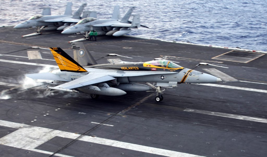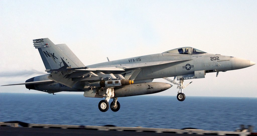 116k | A U.S. Navy F/A-18C Hornet (modex NE300) of Strike Fighter Squadron (VFA) 151 "Vigilantes" recovers aboard the aircraft carrier USS Abraham Lincoln (CVN-72) in 2008(?), during Operation Enduring Freedom. |