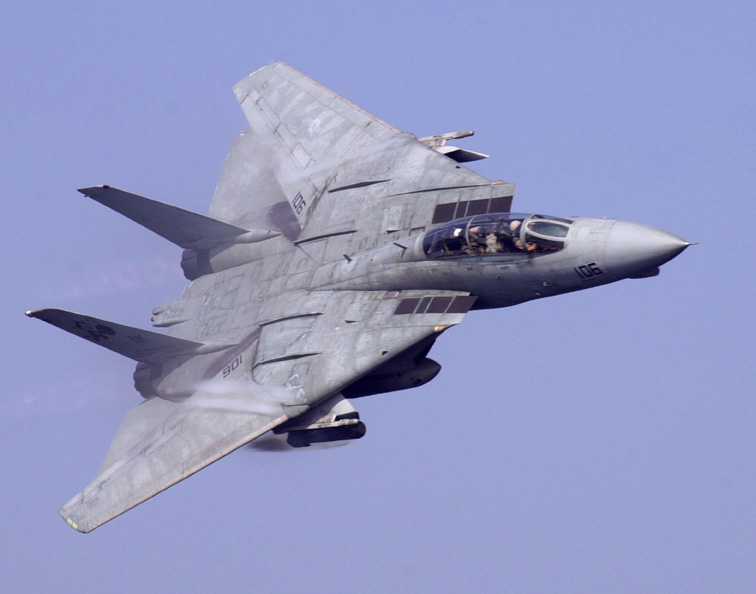 367k | A Grumman F-14D Tomcat (BuNo 164601, modex NK-100) from the "Tomcatters" of Fighter Squadron (VF) 31 flies over the Landing Signal Officer (LSO) platform aboard USS Abraham Lincoln (CVN-72) after returning from a successful proficiency flight, 26 January 2001. The Nimitz-class aircraft carrier was on the final leg of a scheduled six-month deployment to the Persian Gulf in support of Operation Southern Watch. Official U.S. Navy (USN) photo by Photographer's Mate 2nd Class Daniel Wolsey (# 010126-N-6699W-001). |