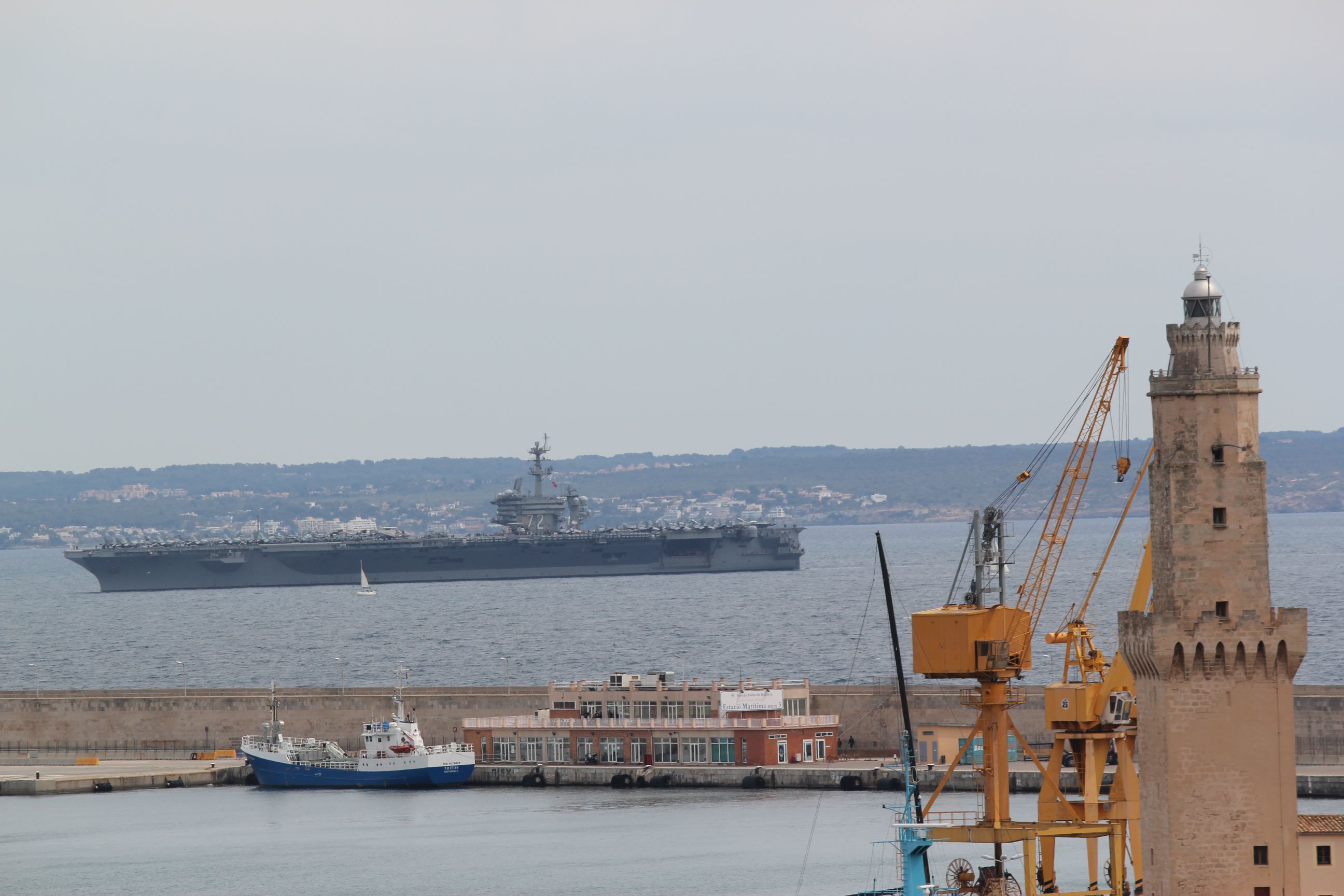 368k | USS Abraham Lincoln (CVN-72), with embarked Carrier Air Wing (CVW) 7, at Palma de Mallorca, Spain, 15 April 2019, on her way to her new homeport, San Diego, California, from Norfolk, Virginia. The 700-year old Porto Pi lighthouse, one of the oldest in the world, can be seen in photo NS0272am. |