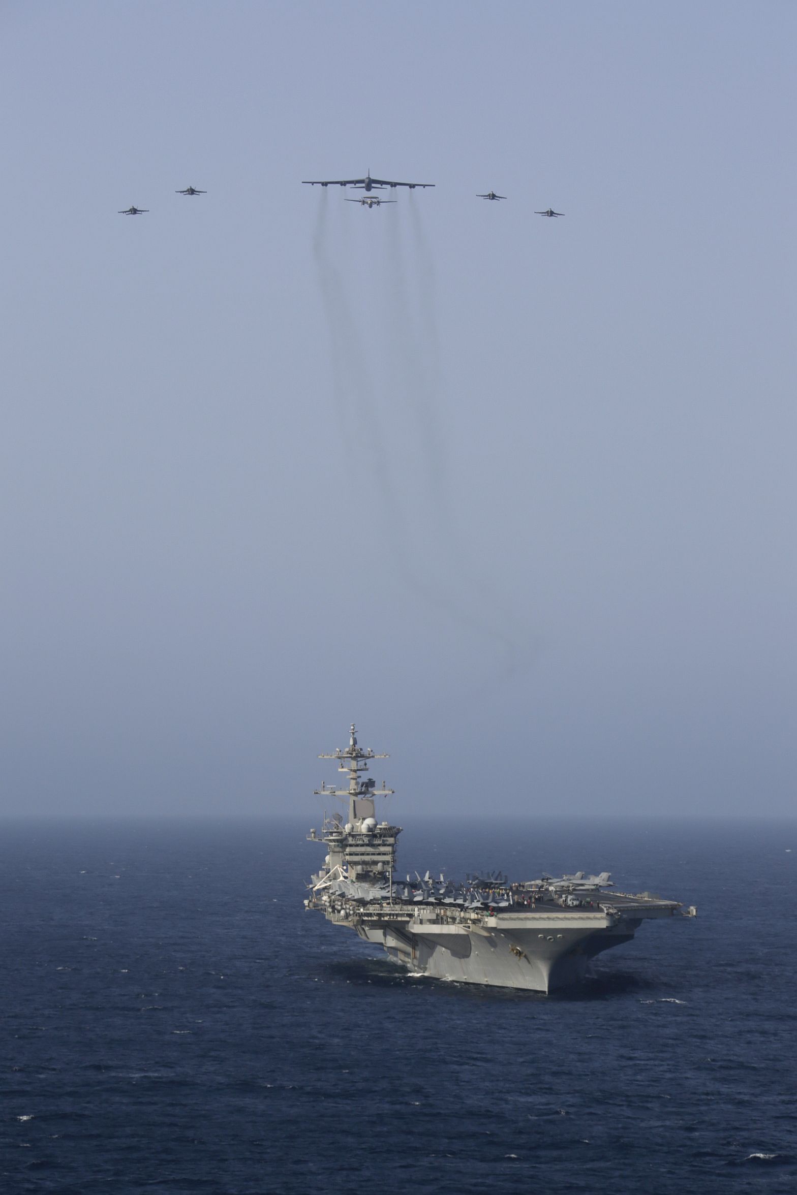 196k | The Abraham Lincoln Carrier Strike Group and a U.S. Air Force B-52H Stratofortress, assigned to the 20th Expeditionary Bomb Squadron and part of the Bomber Task Force deployed to the region, conduct joint exercises in the Arabian Sea, in the U.S. Central Command area of responsibility, 1 June 2019. The demonstration of flexible and adaptable joint operations shows U.S. military forces are prepared to respond to contingencies and defend American interests in the region. With Abraham Lincoln as the flagship, deployed strike group assets include staffs, ships and aircraft of Carrier Strike Group (CSG) 12, Destroyer Squadron (DESRON) 2, the guided-missile cruiser USS Leyte Gulf (CG-55) and Carrier Air Wing (CVW) 7. NS0272ao: U.S. Navy photo by Mass Communication Specialist 1st Class Brian M. Wilbur (# 190601-N-FK070-1404). NS0272aoa: U.S. Navy photo by Mass Communication Specialist 1st Class Brian M. Wilbur (# 190601-N-FK070-1595). |