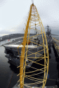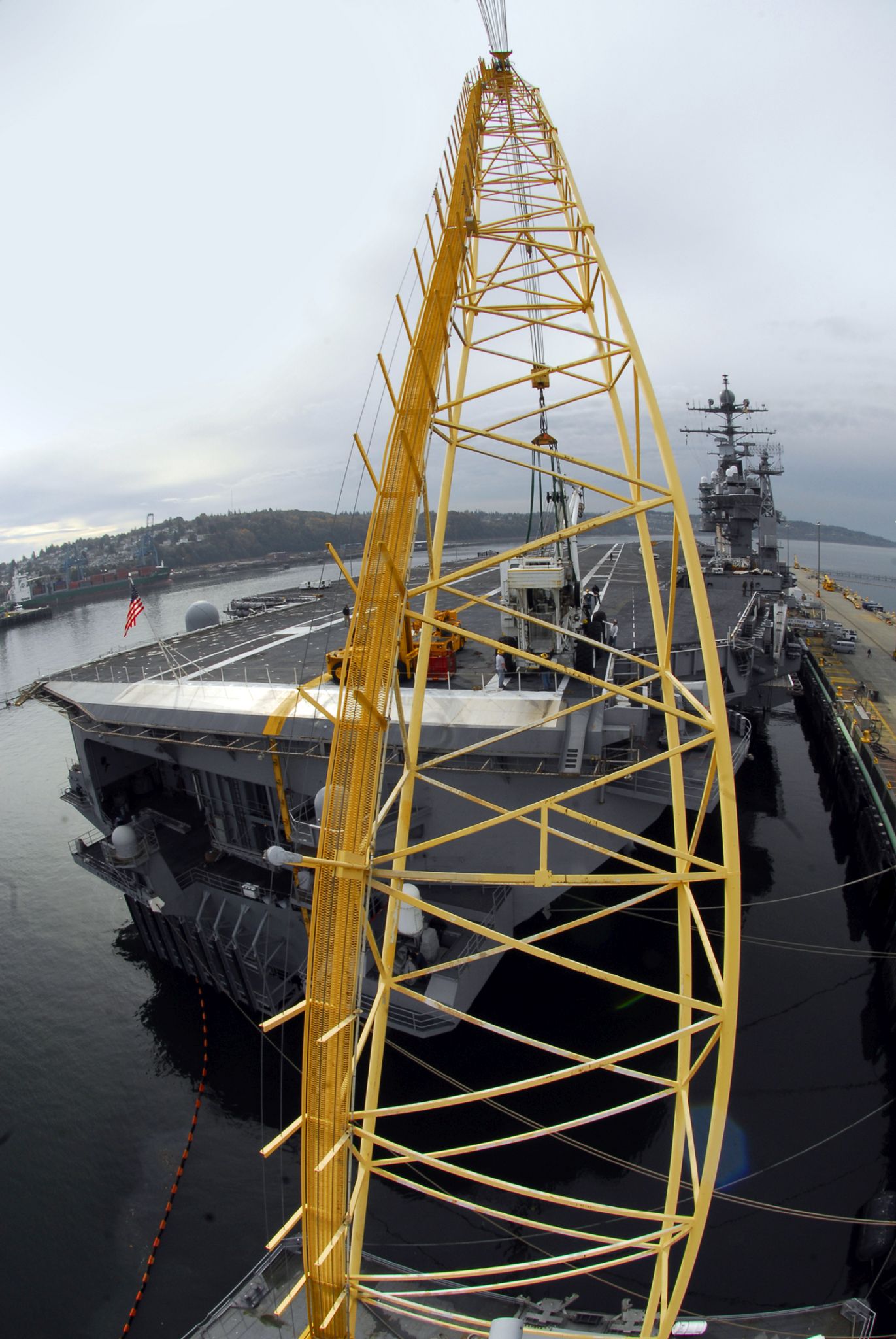 368k | The emergency heavy lift crane aboard USS Abraham Lincoln (CVN-72) is lifted off the flight deck by a Westmont floater crane from Puget Sound Naval Shipyard, 9 October 2007. The crane would undergo load testing at Naval Station Everett to recertify it for shipboard use before being loaded back aboard the Nimitz-class aircraft carrier. U.S. Navy photo by Mass Communication Specialist Seaman Brandon Wilson (# 071009-N-1745W-314). |