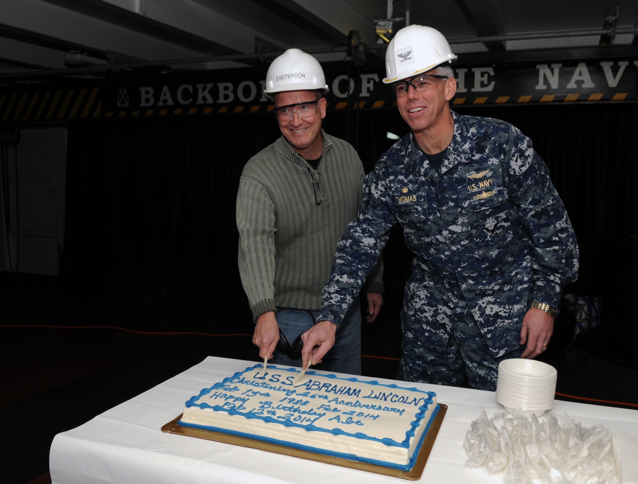 710k | CAPT Karl Thomas, commanding officer of USS Abraham Lincoln (CVN-72), cuts a cake alongside Bruce Easterson, CVN-72 Refueling Complex OverHaul (RCOH) program director, 13 February 2014, to celebrate the 26th anniversary of the ship's christening. The Nimitz-class aircraft carrier was undergoing an RCOH at Newport News Shipbuilding, a division of Huntington Ingalls Industries. U.S. Navy photo by Mass Communication Specialist 2nd Class Joshua E. Walters (# 140213-N-NB694-018). |