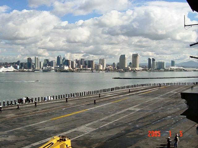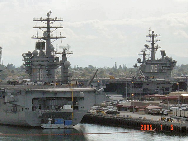 ![]() 5 January 2005 Departing San Diego, USS Nimitz (CVN-68) and USS Ronald Reagan (CVN-76), in the distance, seen from USS John C. Stennis (CVN-74) (128Kb) |