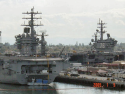 ![]() 5 January 2005 Departing San Diego, USS Nimitz (CVN-68) and USS Ronald Reagan (CVN-76) seen from USS John C. Stennis (CVN-74) (125Kb) |