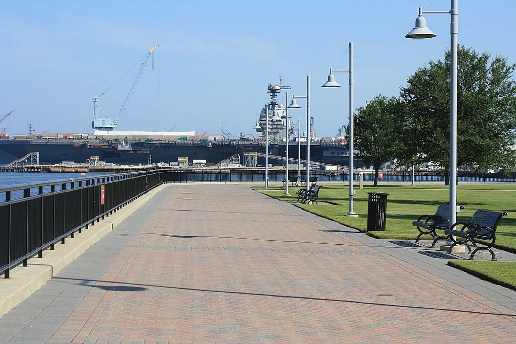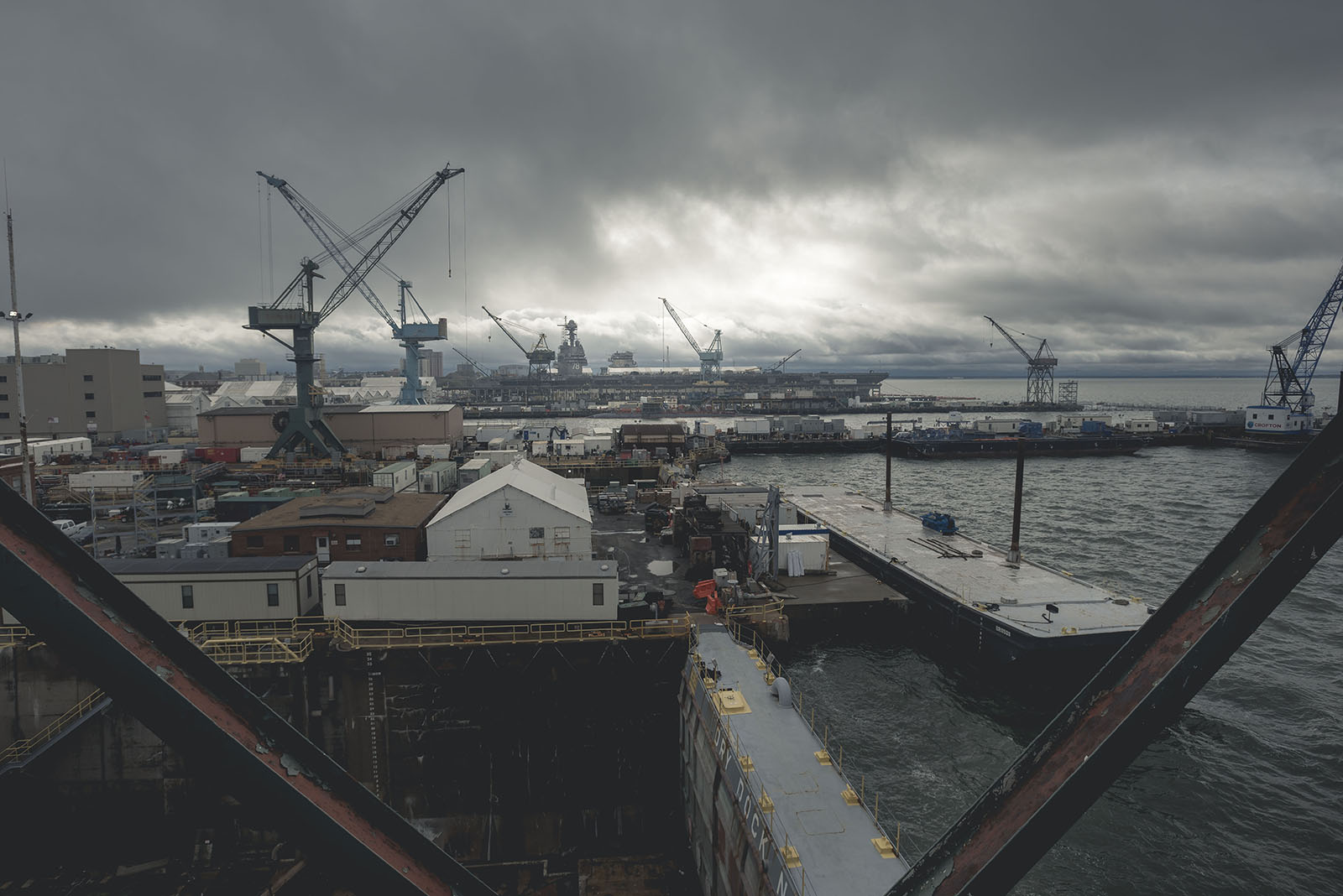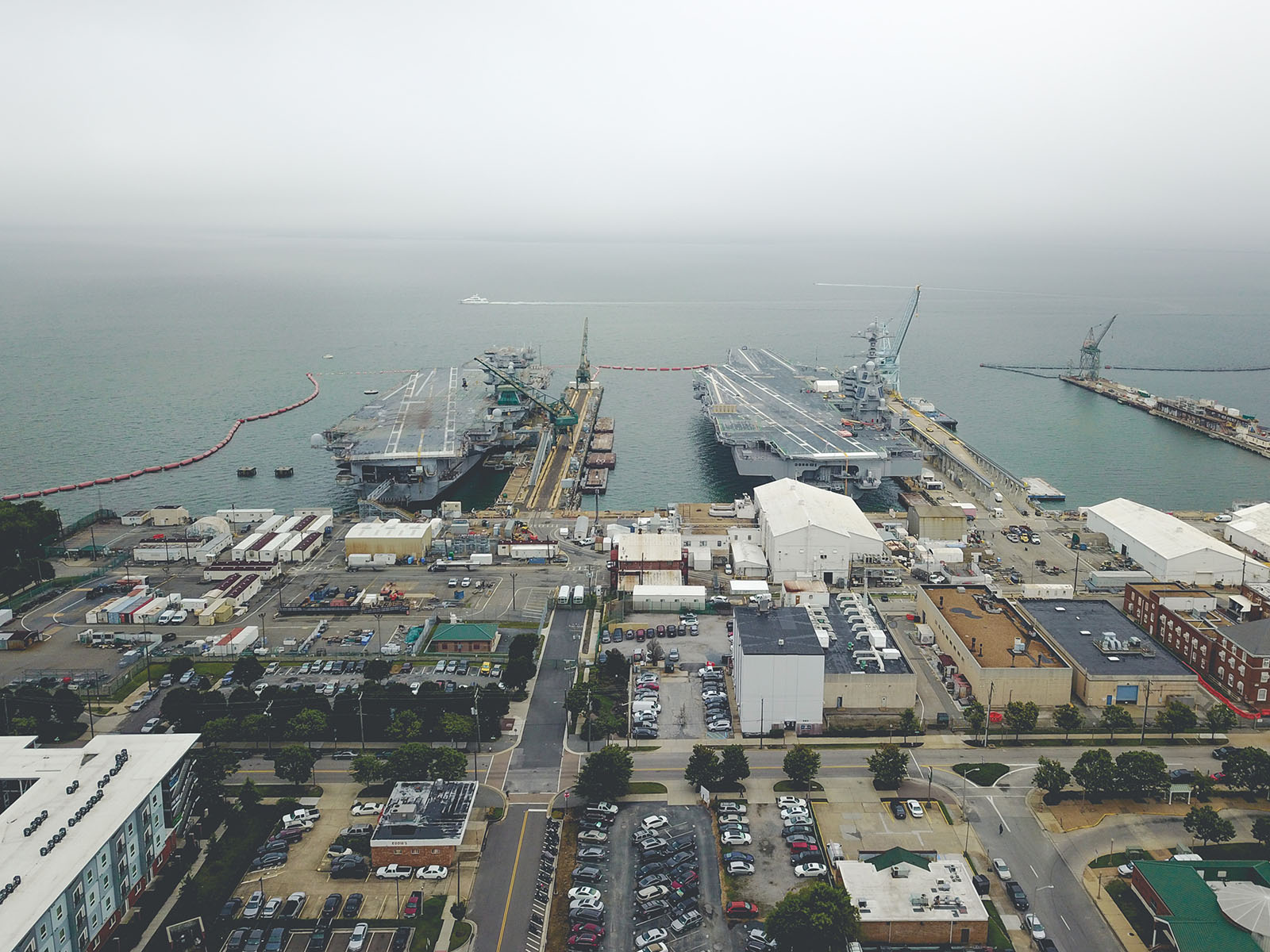 278k | Carriers and subs are lined up along the South yard's piers, 13 November 2018. Huntington Ingalls Industries, Newport News Shipbuilding (HII-NNS) photo by Matt Hildreth, # DCS18-765-30. |