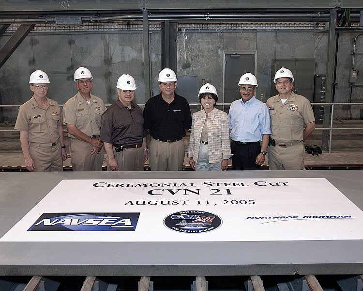 113k | Newport News, Va., Aug. 11, 2005 The participants of the cutting for the first piece of steel for CVN-78, the first ship of the CVN-21 program, pose during a ceremony at Northrop Grumman Newport News shipyard. The ceremony was held at the shipyard's new heavy-plate bay facility, one of several new facilities built for the CVN-21 program. Left to right: RADM H. Denby Starling II, Commander, Naval Air Force, U.S. Atlantic Fleet, USN; RADM David Architzel, Program Executive Officer for Aircraft Carriers, USN; Joe S. Frank, Mayor of Newport News; Mike Petters, president, Northrop Grumman Newport News; Rep. Jo Ann Davis (R-Va.); Rep. Bobby Scott (D-Va.); and CAPT Michael E. McMahon, Commanding Officer, Supervisor of Shipbuilding, Conversion and Repair, Newport News, USN. Photo by John Whalen, courtesy of Northrop Grumman Corporation (# 050811-O-0000W-002). |