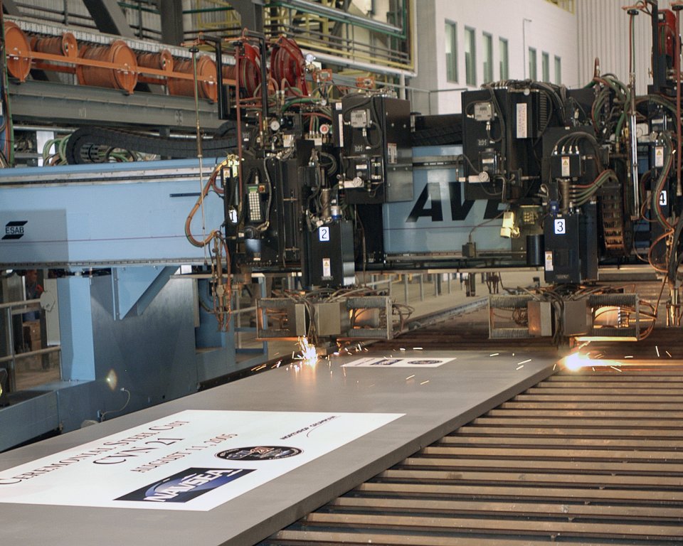160k | The first piece of steel, a 15-ton plate for a side shell unit of CVN-78, the first ship of the CVN-21 program, is cut at the Northrop Grumman Newport News shipyard, August 11, 2005. The ceremony was held at the shipyards new heavy-plate bay facility, one of several new facilities built for the CVN-21 program. Innovations for the CVN-21 program include an enhanced flight deck capable of increased sortie rates, improved weapons movement, a redesigned island, a new nuclear power plant, reduced manning and allowance for future technologies. Photo by John Whalen (# DCS05-417-146). |