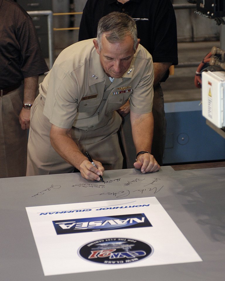 107k | Commander, Operational Test and Evaluation Force and Program Executive Officer for Aircraft Carriers, RADM David Architzel, signs the first steel plate cut for CVN-78, the first ship of the CVN-21 program, during the ceremony at Northrop Grumman Newport News shipyard, August 11, 2008. Photo by John Whalen (# DCS05-417-069). |