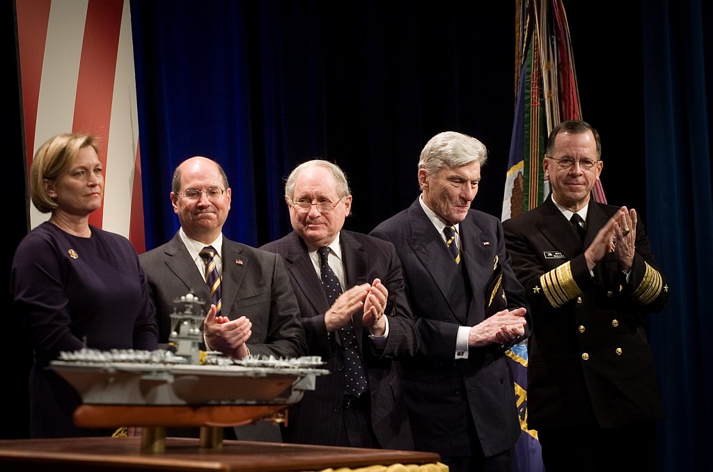 103k | Secretary of the Navy Donald C. Winter, Sen. Carl Levin, Sen. John Warner and Chief of Naval Operations ADM Mike Mullen (l-r) applaud Susan Ford Bates after her remarks at the unveiling and naming of USS Gerald R. Ford (CVN-78). U.S. Navy photo by Mass Communication Specialist 1st Class Chad J. McNeeley (# 070116-N-0696M-095). |
