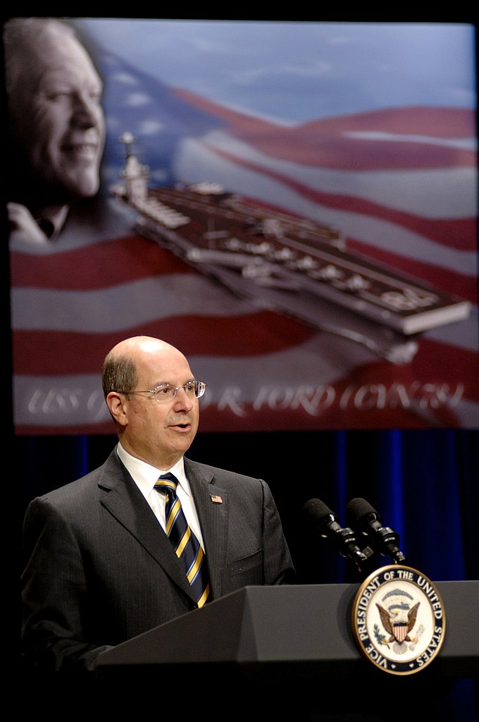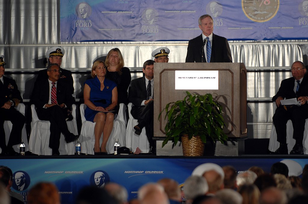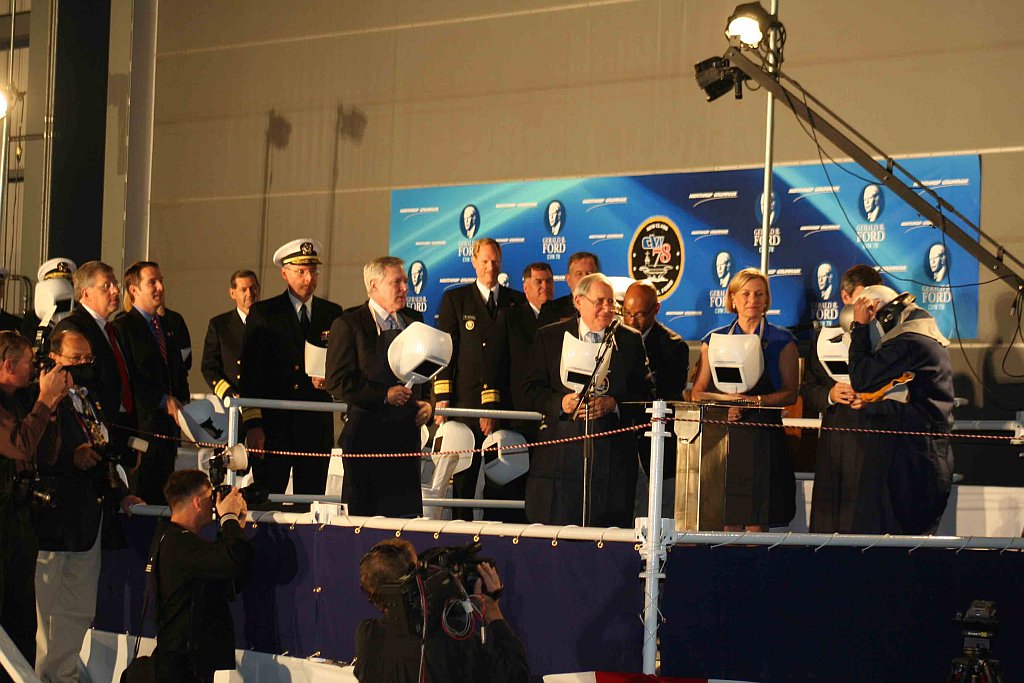 89k | Secretary of the Navy (SECNAV), the Honorable Dr. Donald C. Winter, speaks to an audience of 300 during the official naming ceremony of USS Gerald R. Ford (CVN-78). U.S. Navy photo by Chief Mass Communication Specialist Shawn P. Eklund (# 070116-N-3642E-063). |