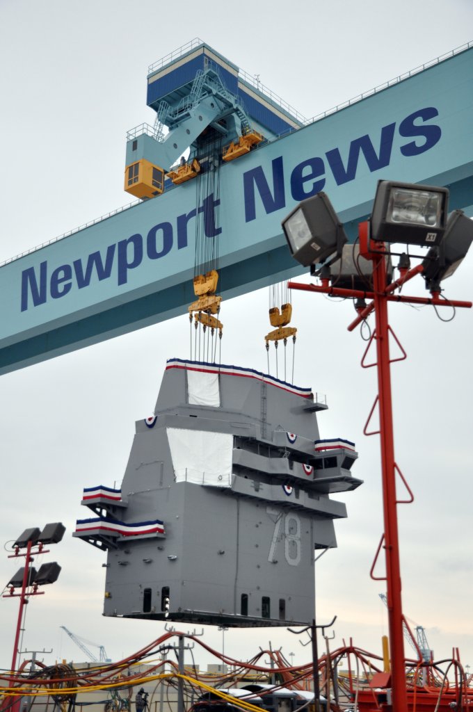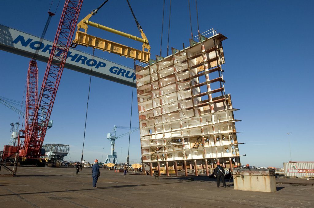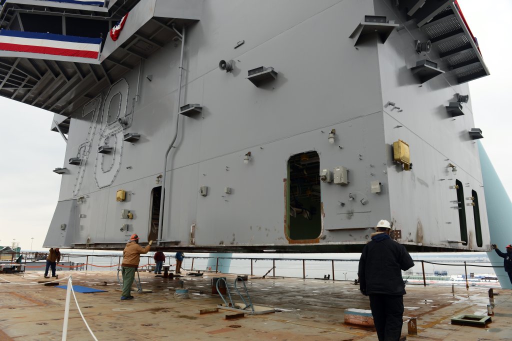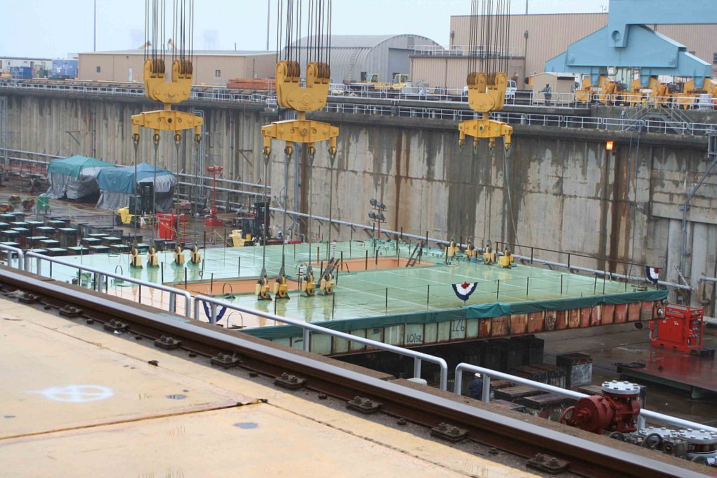 133k | An inner bottom unit of PCU Gerald R. Ford (CVN-78) is hoisted by crane at Northrop Grumman Shipbuilding, Newport News, Va., January 4, 2008. Photo by Ricky Thompson. |