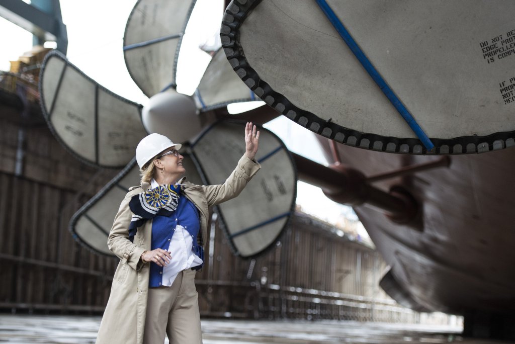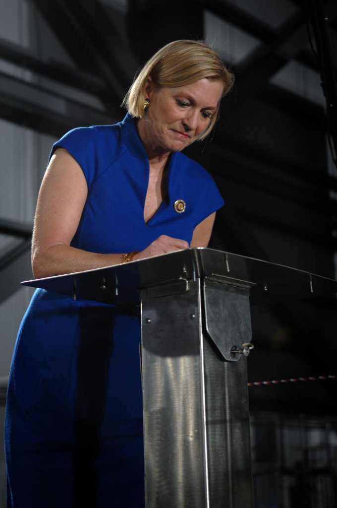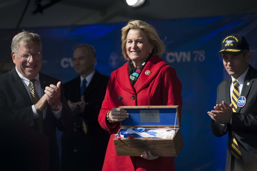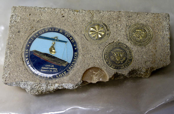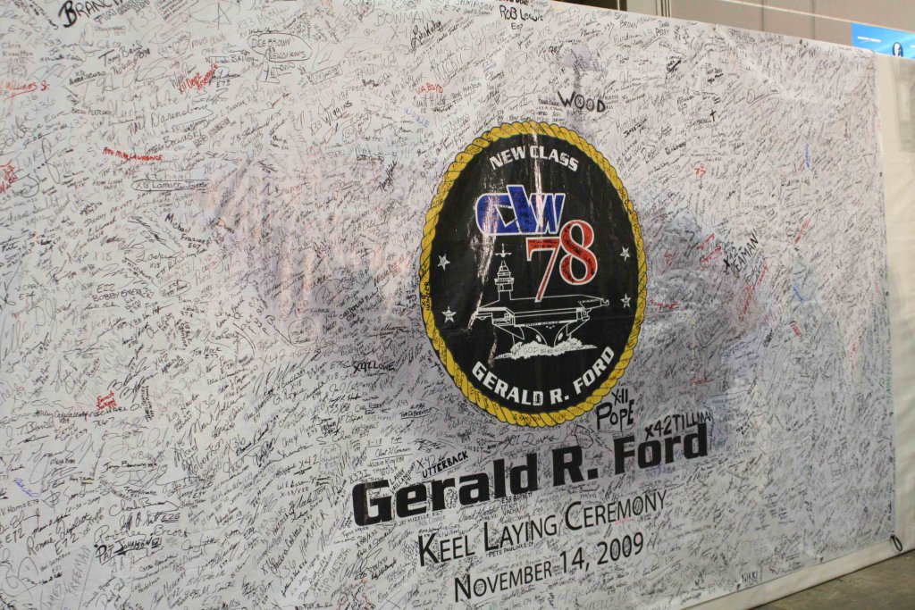 64k | Susan Ford Bales, daughter of former President Gerald R. Ford and ship's sponsor of the aircraft carrier Gerald R. Ford (CVN-78), writes her initials onto a metal plate during the keel laying and authentication ceremony. U.S. Navy photo by Mass Communication Specialist 2nd Class Kevin S. O'Brien (# 091114-N-5549O-126). |