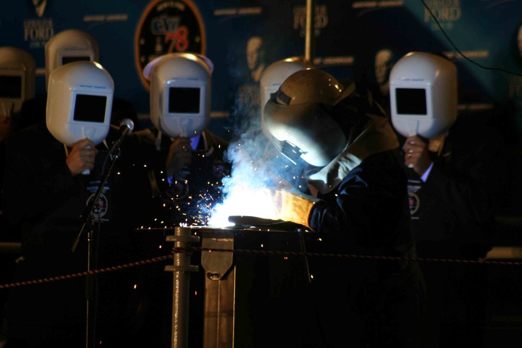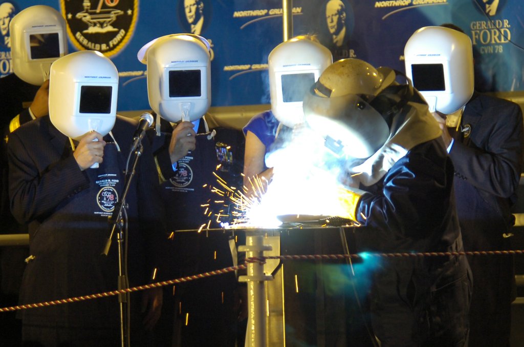 69k | Robert Bowker welds the initials of Susan Ford Bales into the keel of the aircraft carrier Gerald R. Ford (CVN-78) during a keel laying and authentication ceremony at Northrop Grumman Shipbuilding in Newport News. U.S. Navy photo by Mass Communication Specialist 2nd Class Kevin S. O'Brien (# 091114-N-5549O-135). |