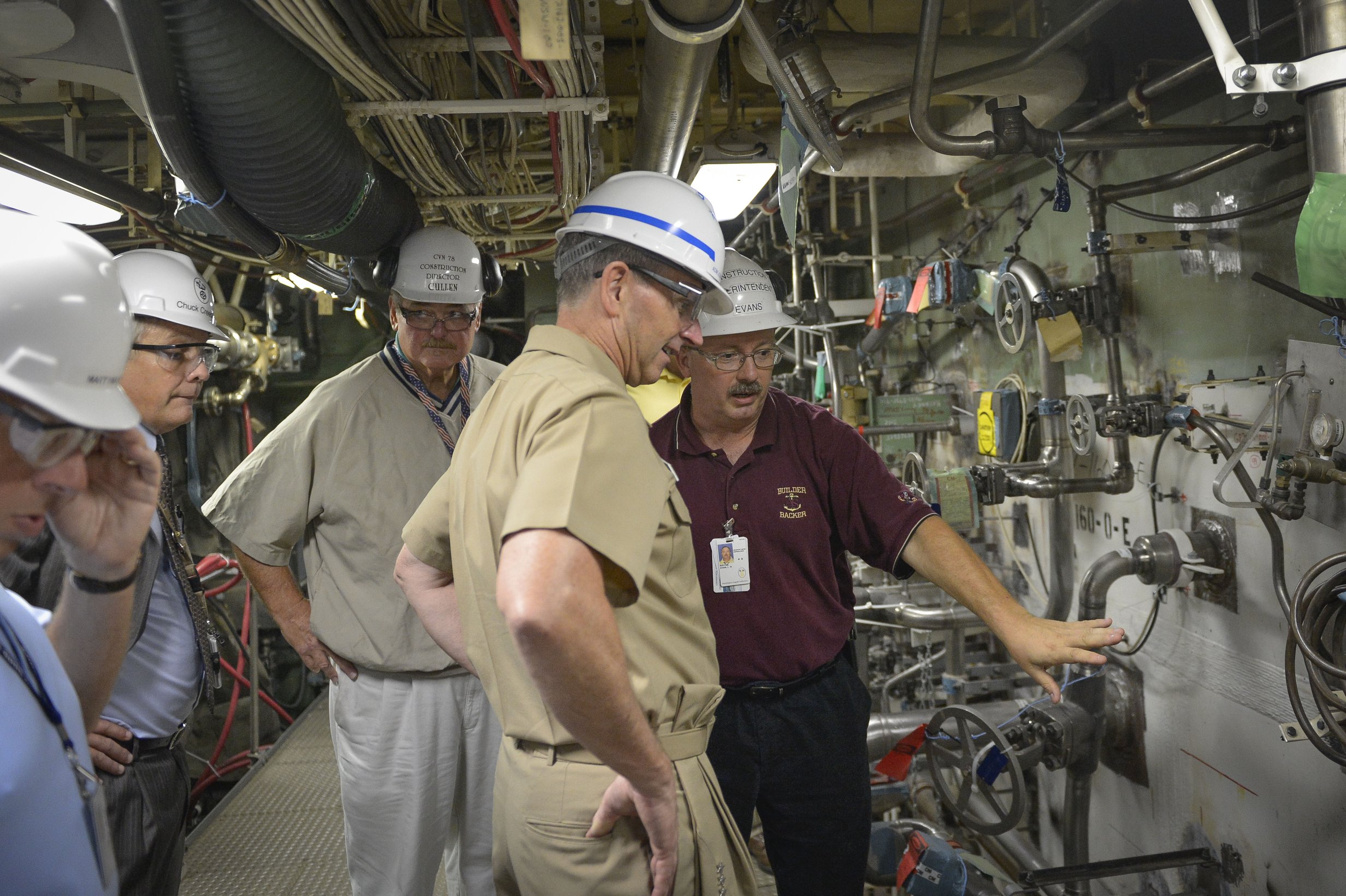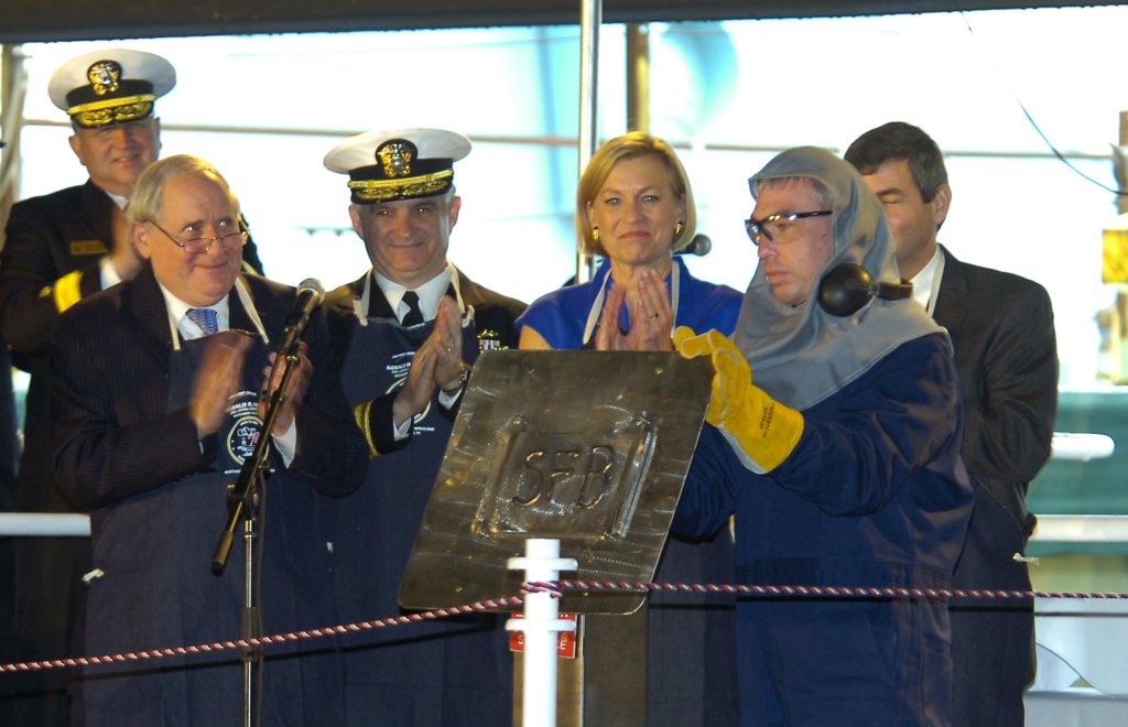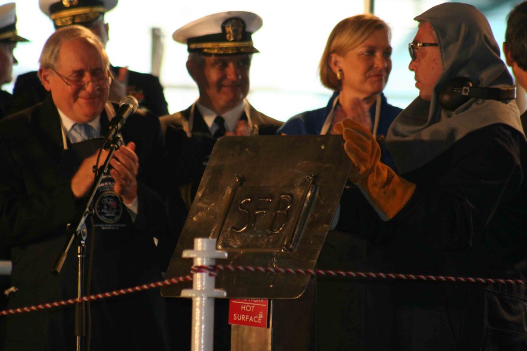 138k | Preparing to weld the Authenticator's initials into the keel plate. In front from left: SECNAV Mabus; Sen. Carl Levin (D, Mich), principal speaker; Susan Ford Bales, Authenticator and ship's Sponsor; Mr. Robert Bowker, Northrop Grumman Shipbuilding welder. |