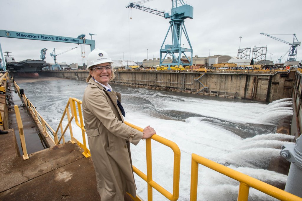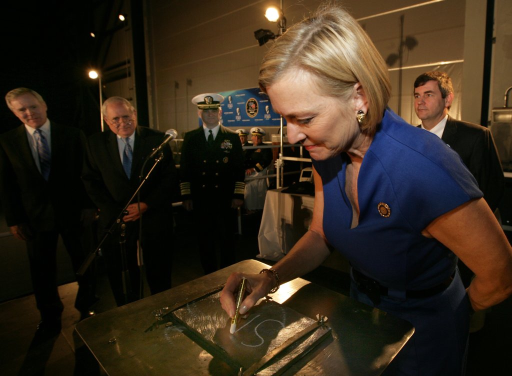 98k | Susan Ford Bales, daughter of President Gerald R. Ford, served as the ship's sponsor and keel authenticator for the ceremony, Newport News, Va., 14 November 2009. Bales authenticated the keel by chalking her initials onto a metal plate. (Left to right) Secretary of the Navy, Ray Mabus; U.S. Senator Carl Levin, (D-Mich); Director of Naval Nuclear Propulsion, ADM Kirkland Donald; Ship Sponsor Susan Ford Bales; and Corporate Vice President and President of Northrop Grumman Shipbuilding Mike Petters. |