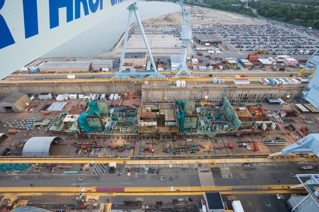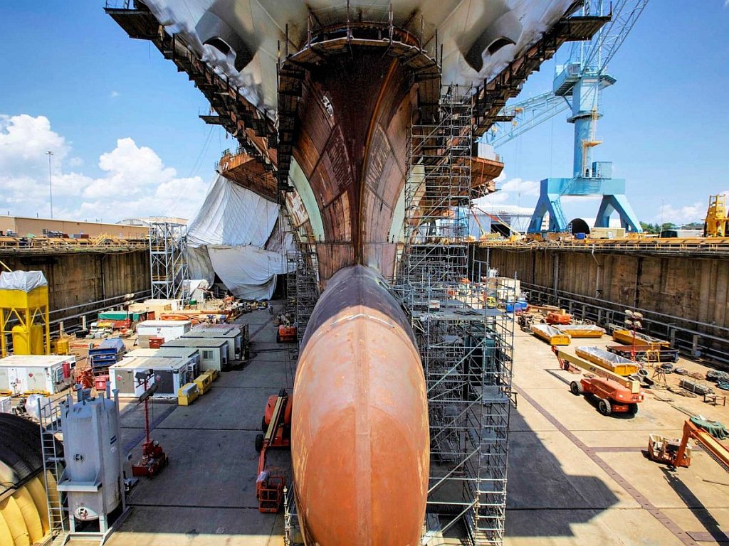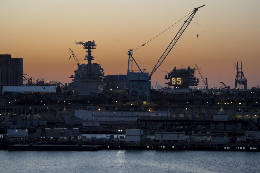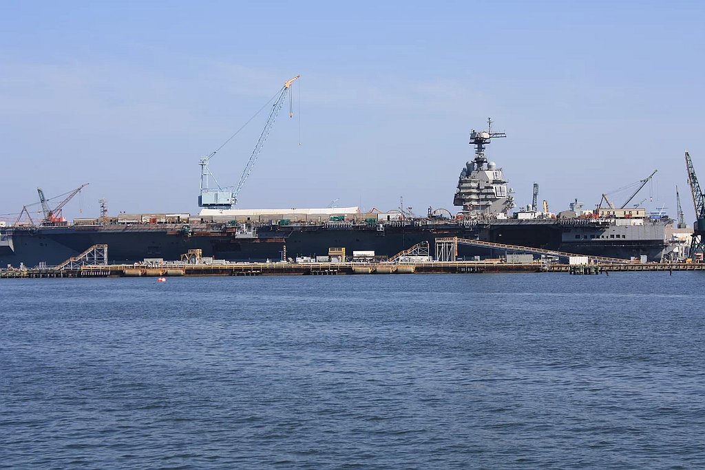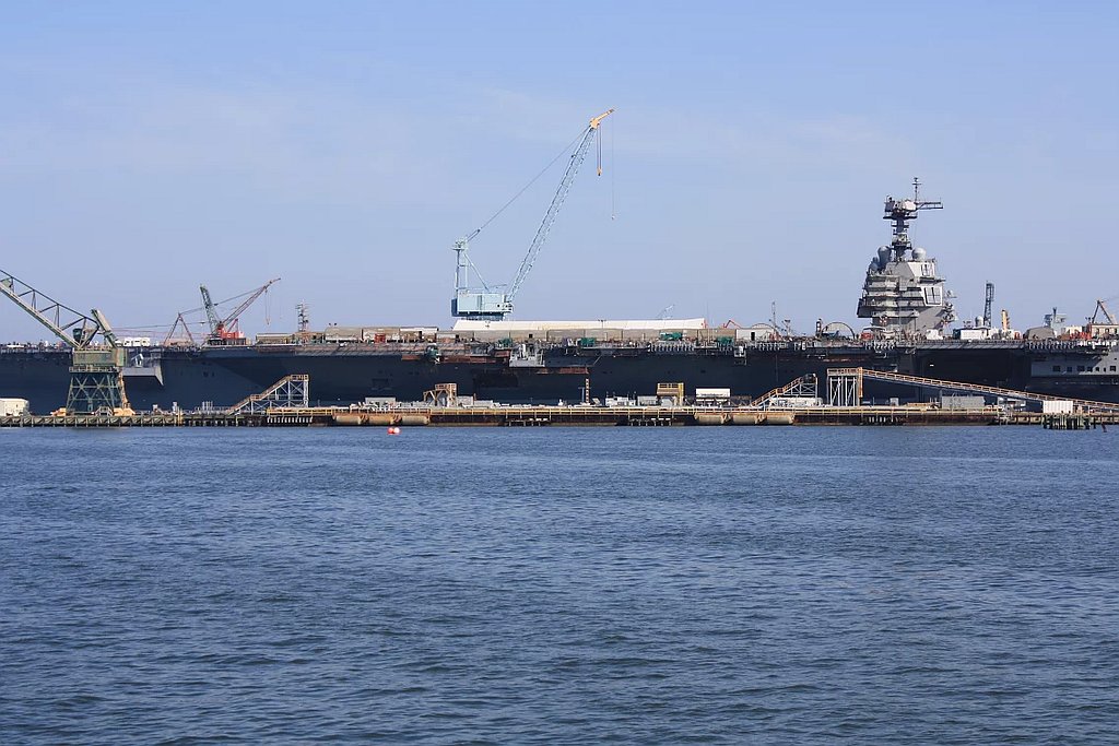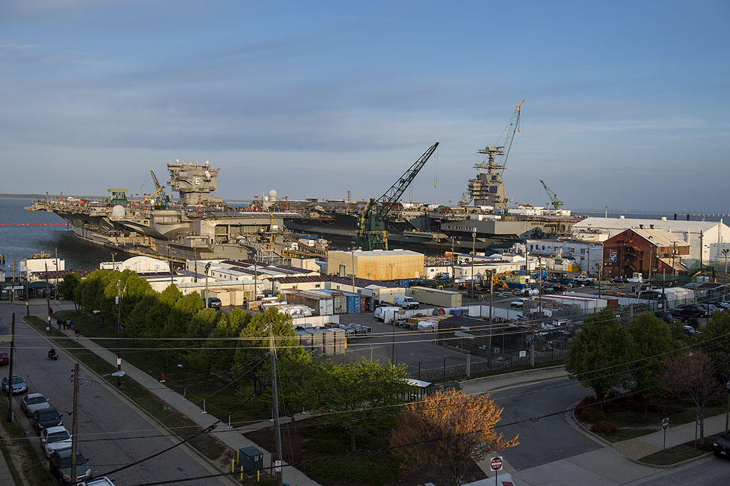 388k | Newport News Shipbuilding, 27 July 2018. Ex-USS Enterprise (CVN-65), left. USS Gerald R. Ford (CVN-78) undergoing her post-shakedown availability. Huntington-Ingalls Industries-Newport News Shipbuilding (HII-NNS) photo by Matt Hildreth. |