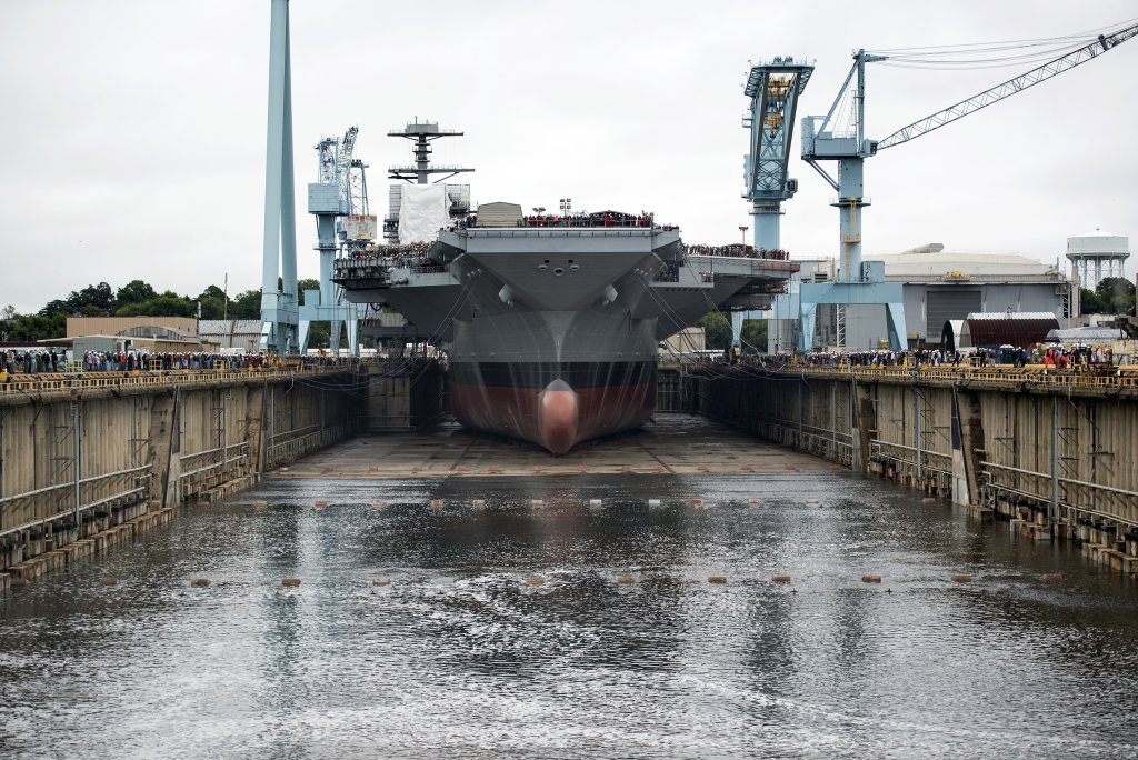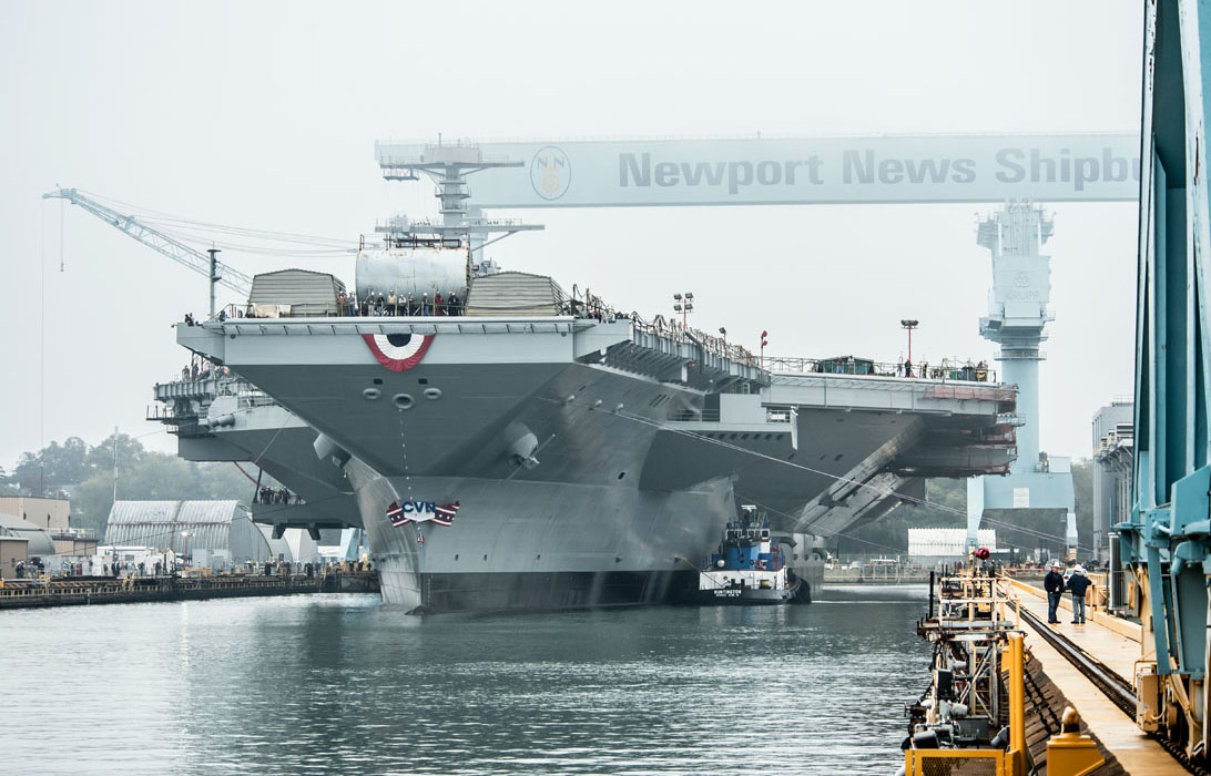 254k | USS Gerald R. Ford (CVN-78) floats pierside the morning of her turn-ship evolution, 17 March 2019. Huntington-Ingalls Industries-Newport News Shipbuilding (HII-NNS) photo by Matt Hildreth. |