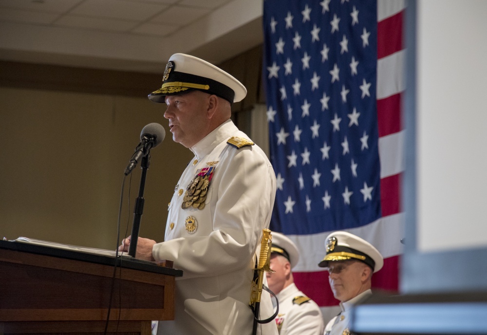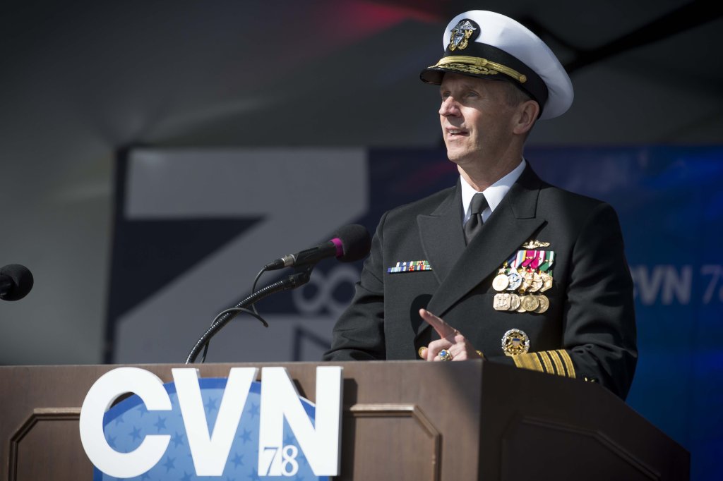 173k | VADM John Alexander, Commander, U.S. Third Fleet, delivers remarks during USS Gerald R. Ford's (CVN-78) change of command ceremony at Vista Point, Norfolk, VA, 10 August 2018. CAPT John J. "Yank" Cummings relieved CAPT Richard C. McCormack. US Navy photo # 180810-N-ZE240-0170. |