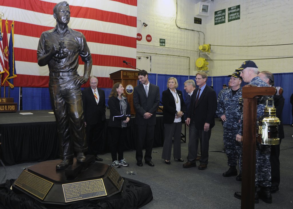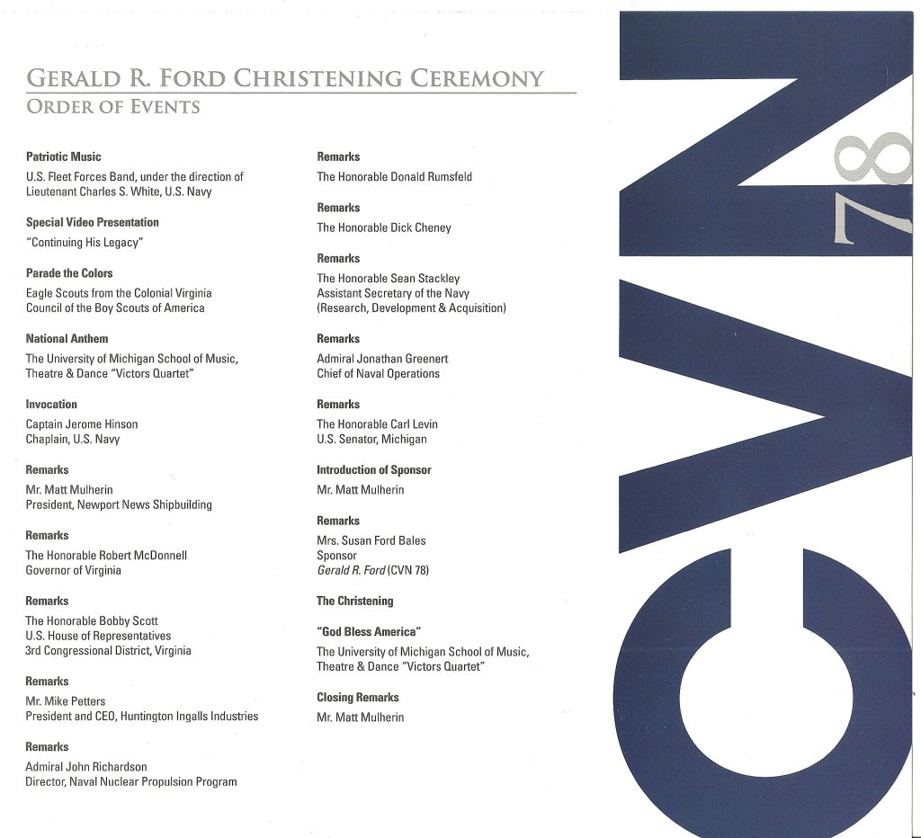 140k | CVN-78 is named after Gerald Rudolph Ford, Jr. (1913–2006), 38th President of the United States of America (1974–1977). (Read about LCDR Gerald R. Ford, Jr, USNR, biography and WW2 service at the Naval Historical Center website.) Gerald R. Ford, Jr. became the fourth consecutive President to have served in the US Navy. He was the first vice president in American history to succeed to the nation's highest office because of the resignation of a president, and he was the first person to occupy the White House without being elected either president or vice president. He viewed himself as "a moderate in domestic affairs, a conservative in fiscal affairs, and a dyed-in-the-wool internationalist in foreign affairs." Ford acted vigorously to maintain US power and prestige after the collapse of Cambodia and South Vietnam. Preventing a new war in the Middle East remained a major objective. Detente with the Soviet Union continued. On Inauguration Day his successor, President Carter, began his speech: "For myself and for our Nation, I want to thank my predecessor for all he has done to heal our land." |