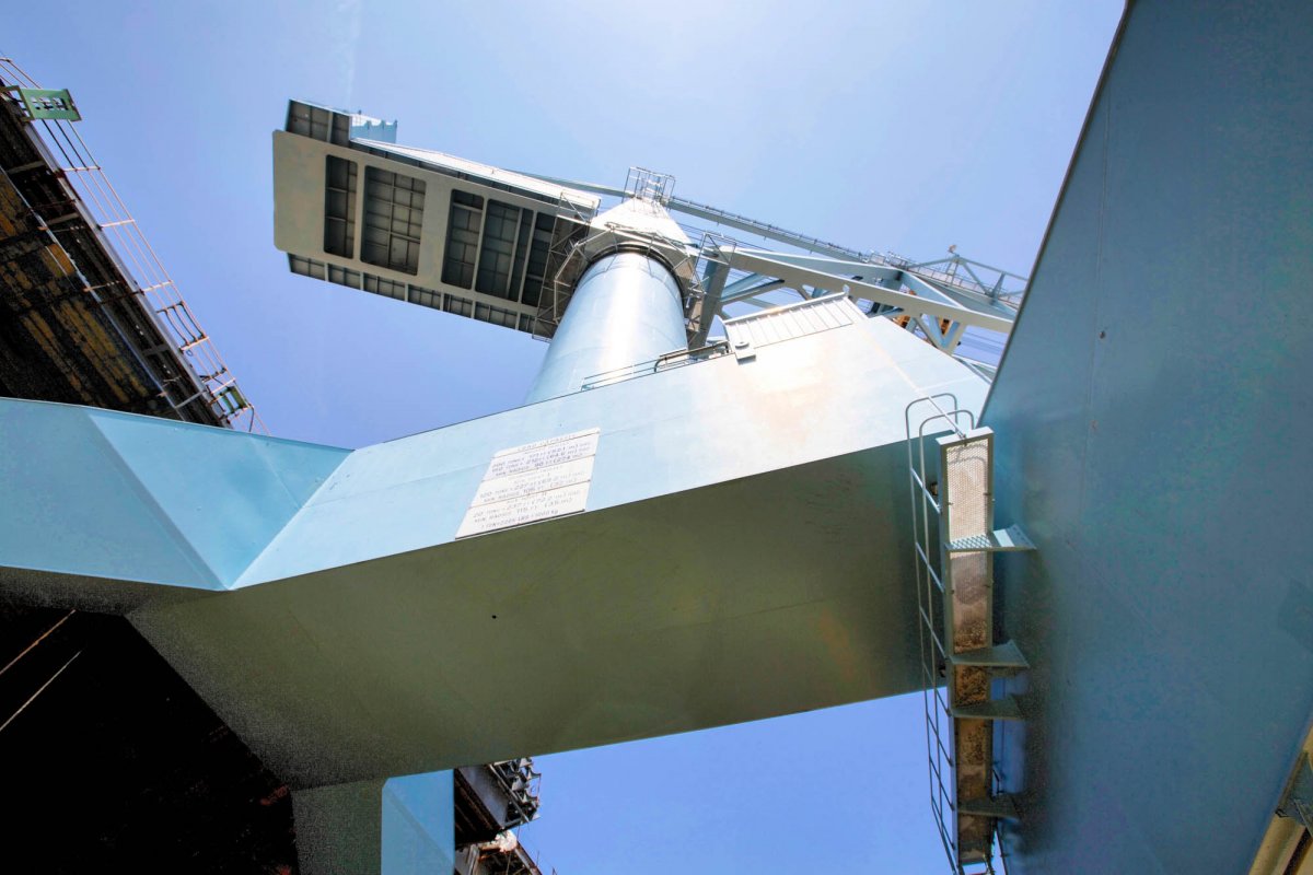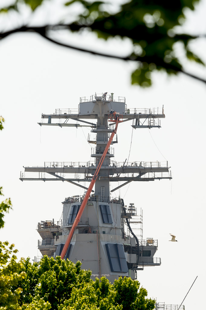 206k | The flag flies high atop a mast of USS Gerald R. Ford (CVN-78) at Newport News Shipbuilding, 4 July 2019. Huntington-Ingalls Industries-Newport News Shipbuilding (HII-NNS) photo by Matt Hildreth. |