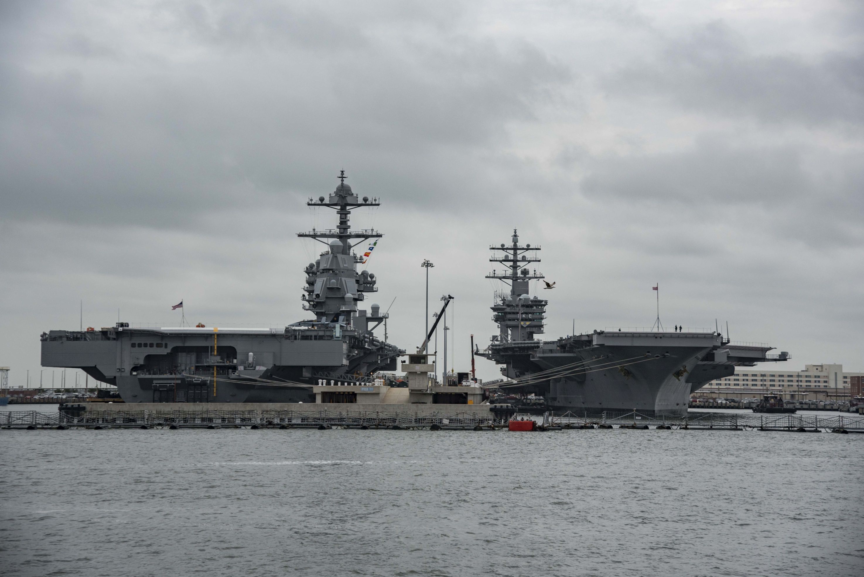 632k | Newport News Shipbuilding, 3 October 2018. Ex-USS Enterprise (CVN-65)—closer to camera—, and USS Gerald R. Ford (CVN-78) undergoing her post-shakedown availability. Huntington-Ingalls Industries-Newport News Shipbuilding (HII-NNS) photo by Ashley Cowan. |