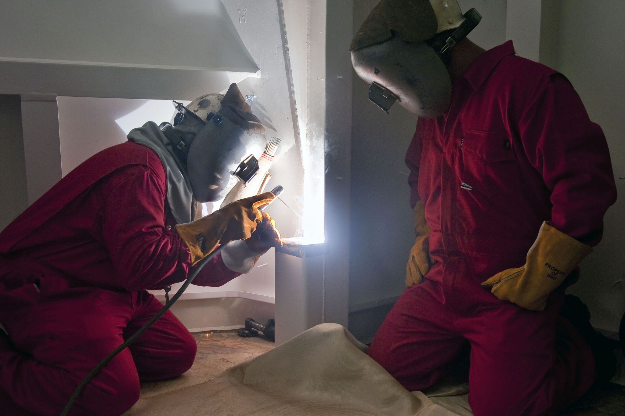 72k | Mr. Bowker welds Susan Ford Bales' initials into the keel plate to authenticate the keel laying. |