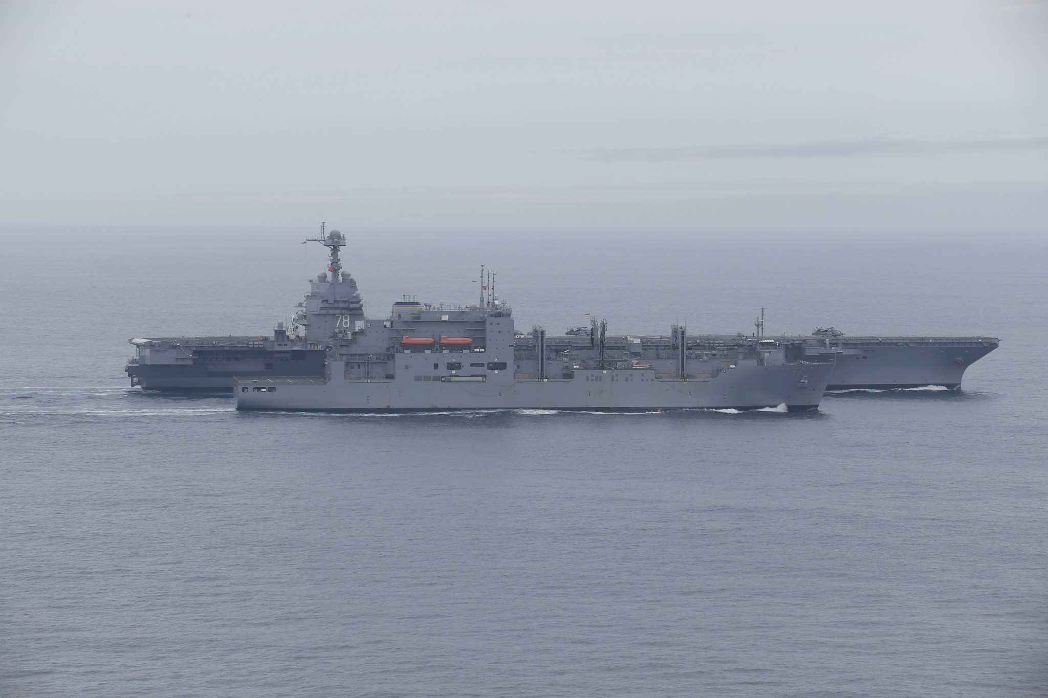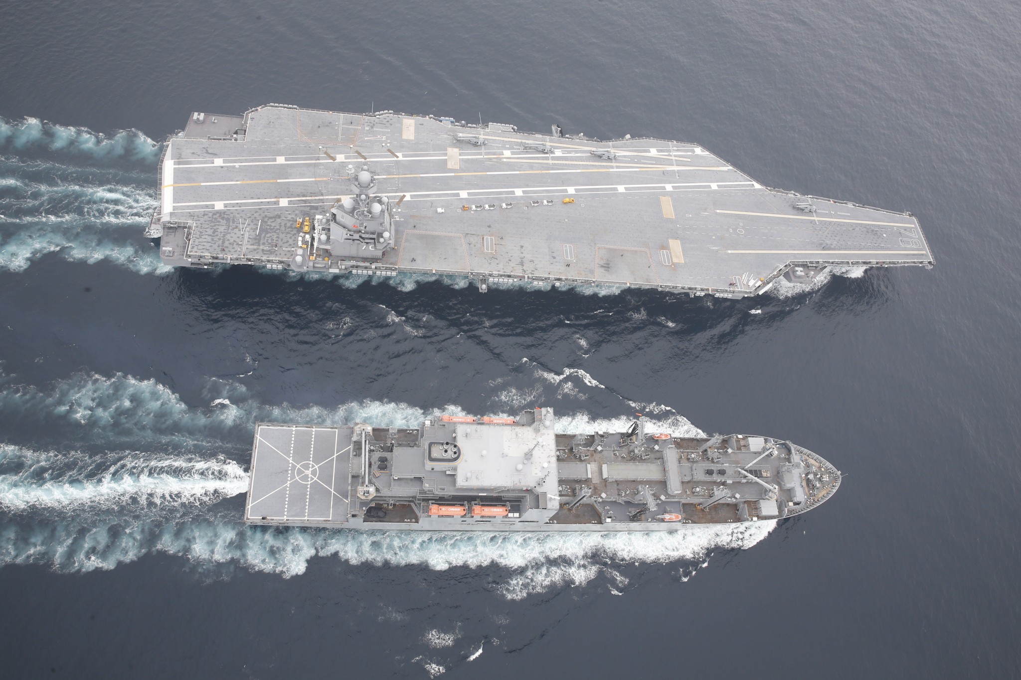 289k | USS Gerald R. Ford (CVN-78) and the Italian aircraft carrier ITS Cavour (CVH-550) [page in Italian] transit the Atlantic Ocean, 20 March 2021, marking the first time a Ford-class and Italian carrier have operated together underway. As part of the Italian Navy's Ready for Operations (RFO) campaign for its flagship, Cavour was conducting sea trials in coordination with the F-35 Lightning II Joint Program Office's Patuxent River Integrated Test Force to obtain official certification to safely operate the F-35B. Gerald R. Ford was conducting integrated carrier strike group operations during independent steaming event 17 as part of her post-delivery test and trials phase of operations. U. S. Navy photo by Mass Communication Specialist 3rd Class Riley McDowell (# 210320-N-OH637-1157). |