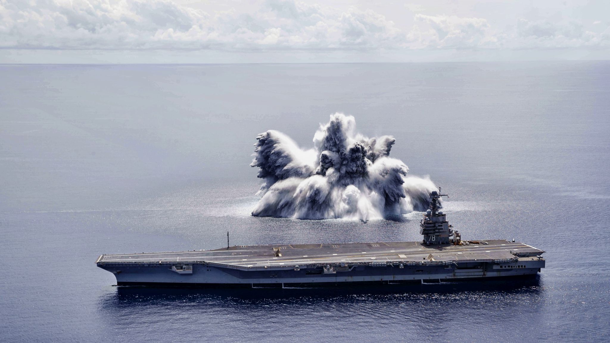 344k | USS Gerald R. Ford (CVN-78) completes the first scheduled explosive event of Full Ship Shock Trials while underway in the Atlantic Ocean, 18 June 2021. The U.S. Navy conducts shock trials of new ship designs using live explosives to confirm that our warships can continue to meet demanding mission requirements under harsh conditions they might encounter in battle. NS027862: U.S. Navy photo by Mass Communication Specialist 3rd Class Riley B. McDowell (# 210609-N-OH637-1001). NS027862a: U.S. Navy photo by Mass Communication Specialist 3rd Class Riley B. McDowell (# 210609-N-OH637-1004). |