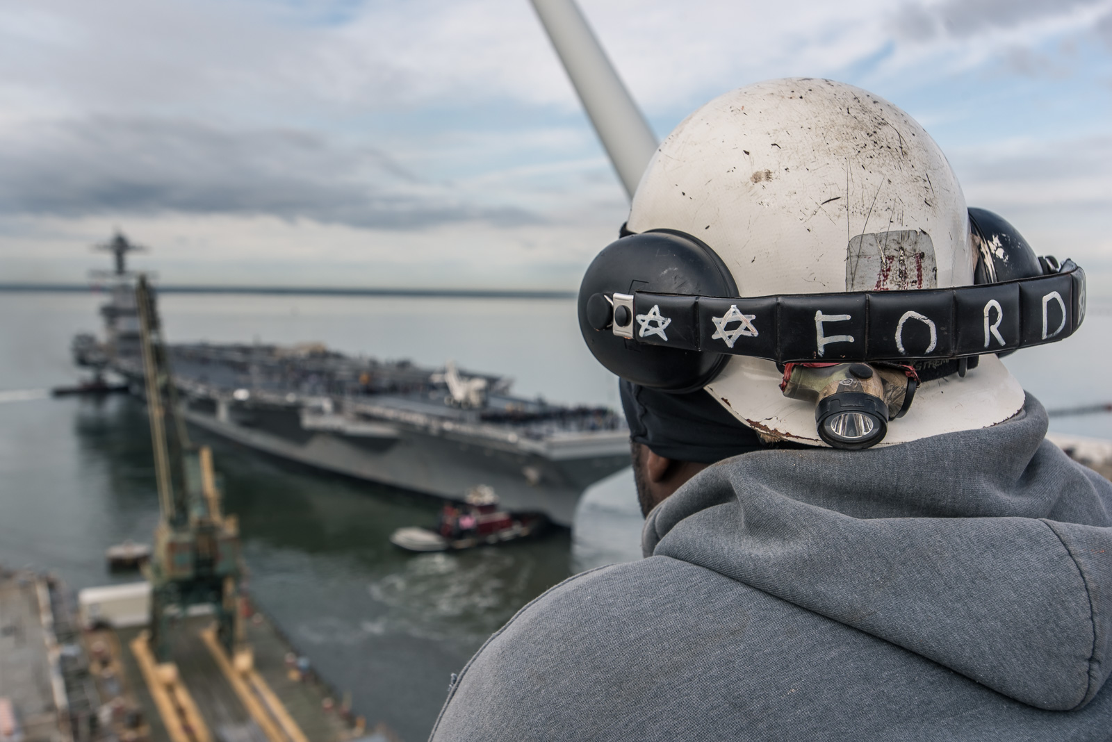 435k | A shipbuilder watches from the Island House of the former USS Enterprise (CVN-65) as USS Gerald R. Ford (CVN-78) pulls away from Pier 3 for sea trials, 25 October 2019. Huntington-Ingalls Industries-Newport News Shipbuilding (HII-NNS) photo by Ashley Cowan, # DCS19-615-47. |