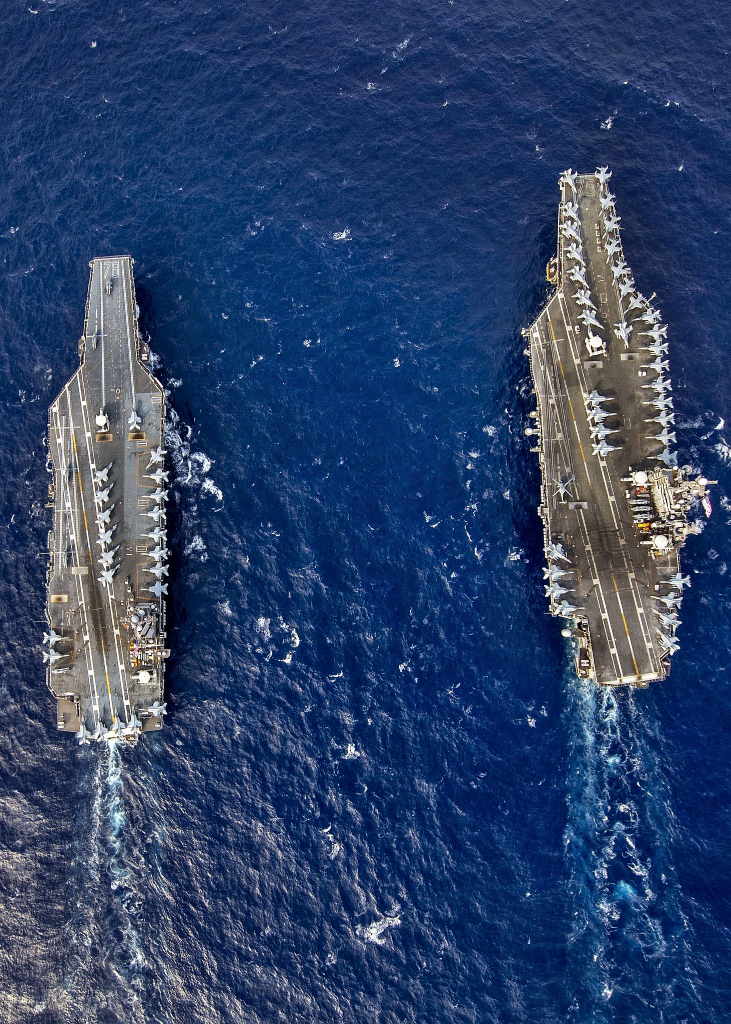 584k | USS Gerald R. Ford (CVN-78) and USS Harry S. Truman (CVN-75) transit the Atlantic Ocean, 4 June 2020, marking the first time a Ford-class and a Nimitz-class aircraft carrier operated together underway. Gerald R. Ford was underway conducting integrated air wing operations, and the Harry S. Truman Carrier Strike Group remained at sea in the Atlantic as a certified carrier strike group force ready for tasking in order to protect the crew from the risks posed by COVID-19, following their successful deployment to the U.S. 5th and 6th Fleet Areas of Operation. NS027869: U.S. Navy photo by Mass Communication Specialist Seaman Riley McDowell (#200604-N-OH637-1312). NS027869a: U.S. Navy photo by Mass Communication Specialist Seaman Riley McDowell (#200604-N-OH637-1292). NS027869b: U.S. Navy photo by Mass Communication Specialist Seaman Riley McDowell (#200604-N-OH637-1416). NS027869c: U.S. Navy photo by Mass Communication Specialist Seaman Riley McDowell (#200604-N-OH637-1277). NS027869d: U.S. Navy photo by Mass Communication Specialist Seaman Riley McDowell (#200604-N-OH637-1376). NS027869e: U.S. Navy photo by Mass Communication Specialist Seaman Riley McDowell. |