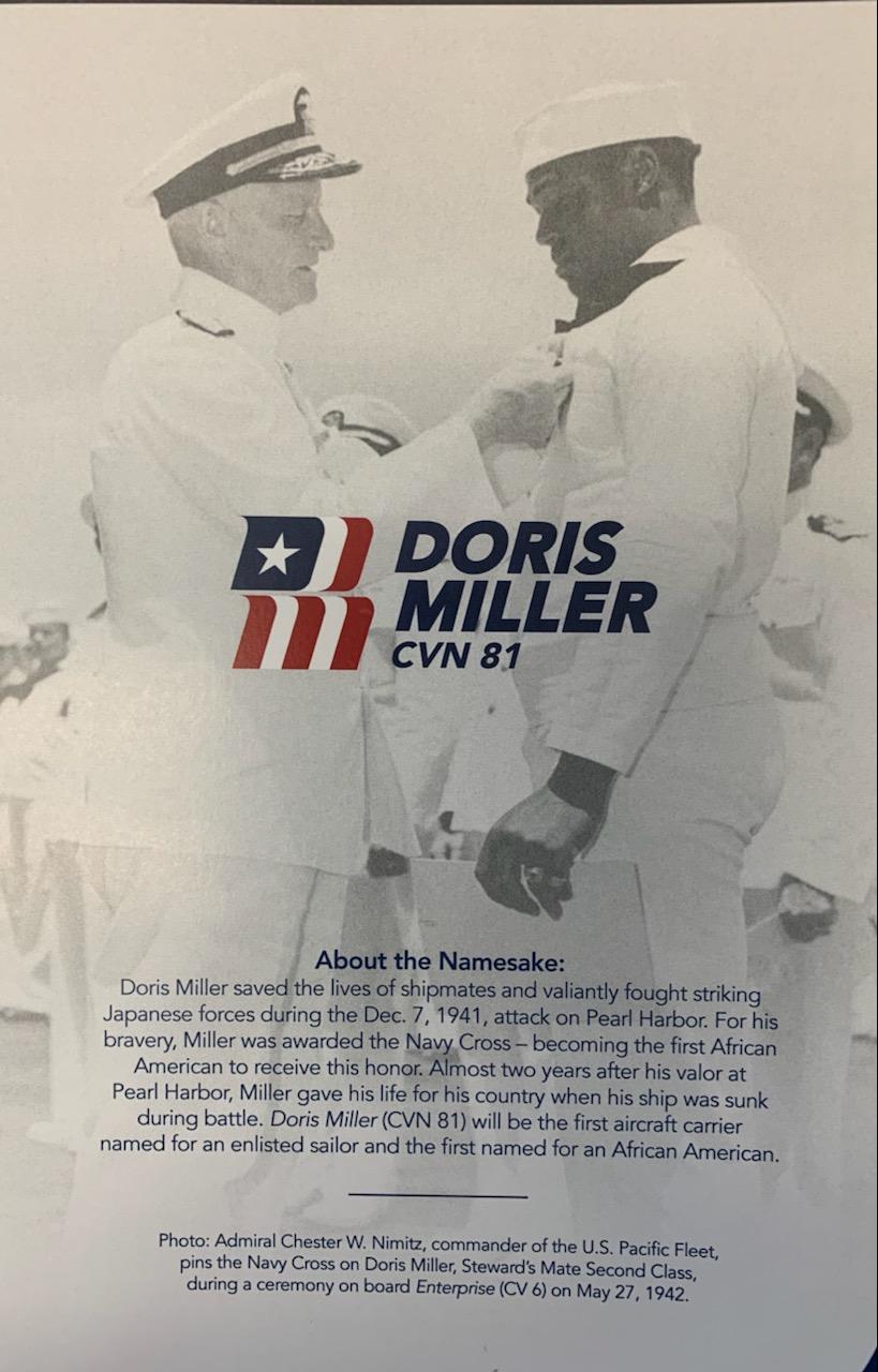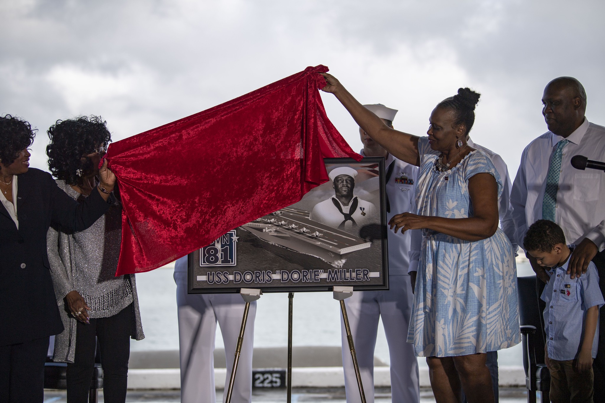 601k | Family members of late Ship's Cook 3rd Class Doris Miller unveil a plaque commemorating the future Navy ship, the Ford-class aircraft carrier USS Doris Miller (CVN‑81), at a Dr. Martin Luther King Jr. Day celebration event at Joint Base Pearl Harbor-Hickam, 20 January 2020. U.S. Navy photo by Mass Communication Specialist 2nd Class Justin R. Pacheco (# 200120-N-NU281-1208). |